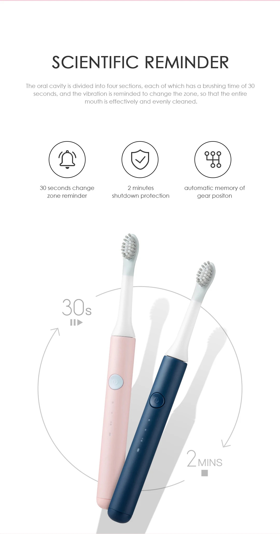 Полость рта делится на четыре области, которые очищаются каждые 30 секунд, автоматически останавливаются на одну секунду каждые 30 секунд, автоматически останавливаются через 2 минуты и запоминают последний режим.
