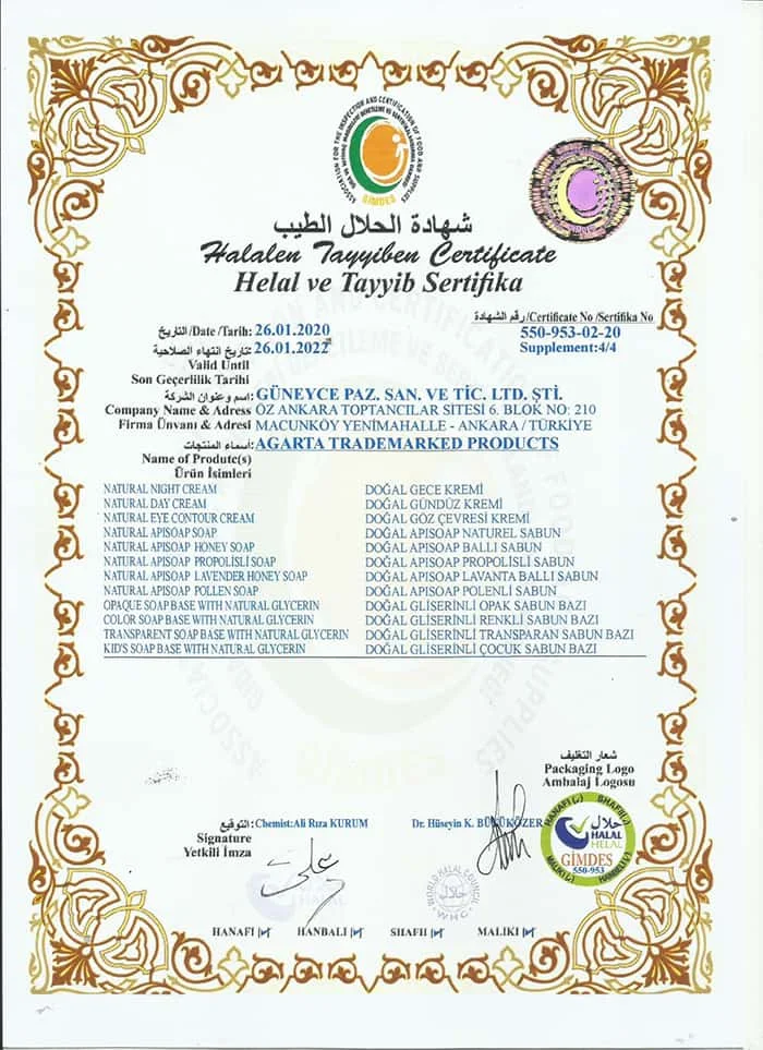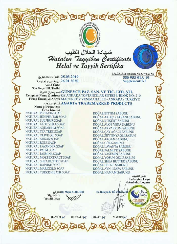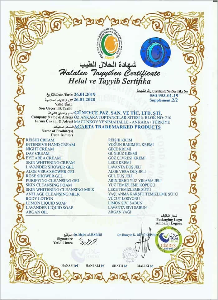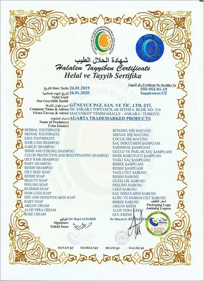 Агарта натуральные травяные косметические продукты производятся в соответствии с условиями, требуемыми компетентными органами. По этой причине он был удостоенХаляль сертификат.