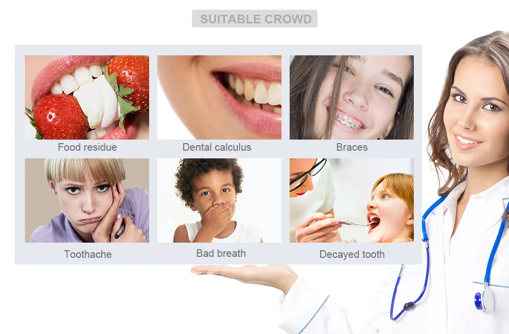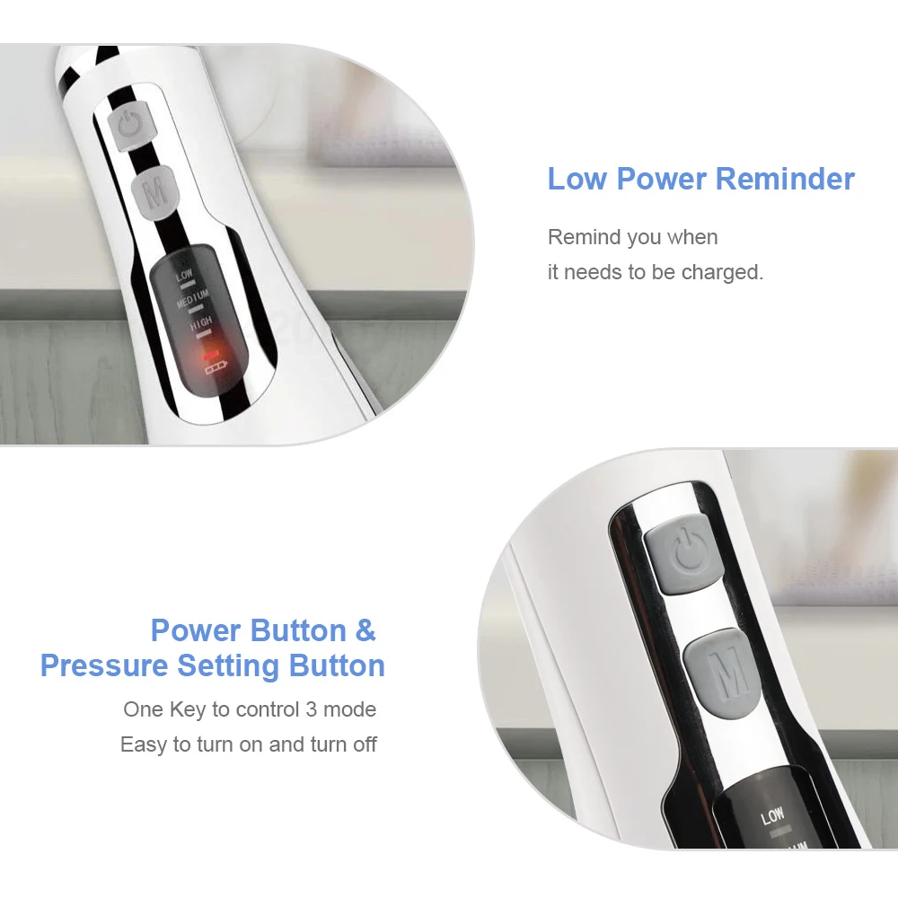 2. 3 режима очистки и функция массажа: мягкое давление (для чувствительных людей), стандартное давление (эффективная чистота, для большинства людей) и сильное давление (для толпы глубокой чистоты полости рта) С индикацией светодиодный светильник подходит для различных условий зубов и десен. Нажмите кнопку «M» и удерживайте в течение 3 секунд, чтобы войти в режим массажа, который может защитить ваши зубы и десны.