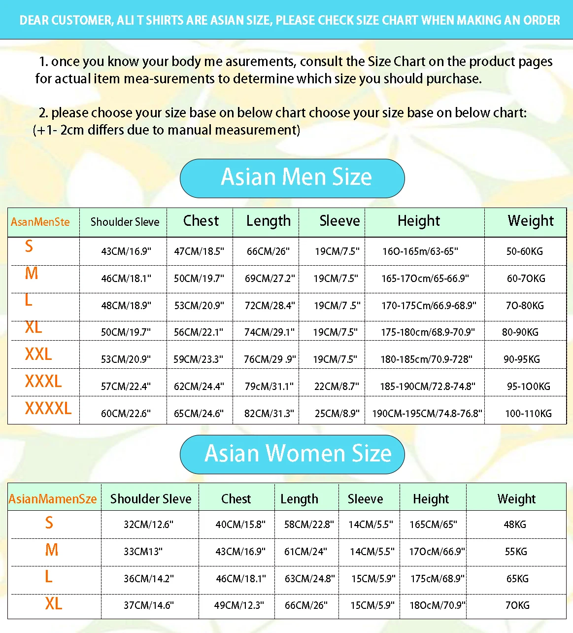 Примечание 1: Мы Азиатские размеры. Азиатский размер немного меньше, чем американский размер. 1 дюйм = 2,54 см, 1 см = 0,39 дюймов