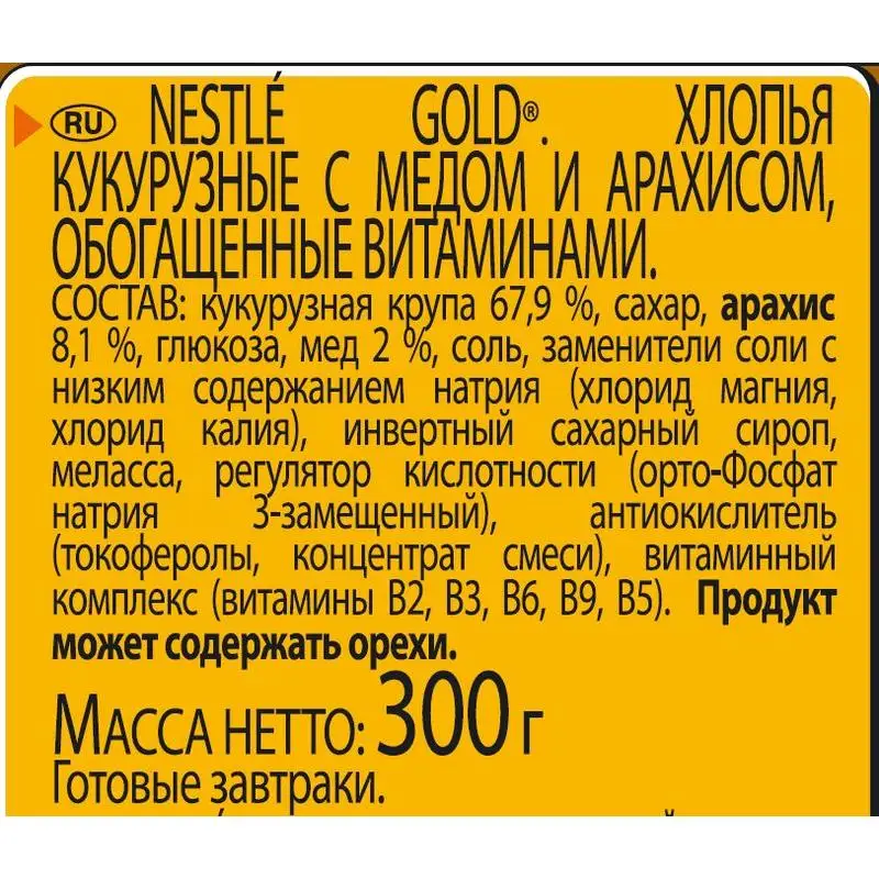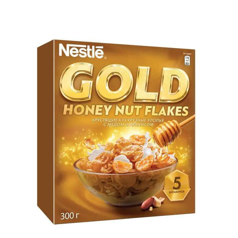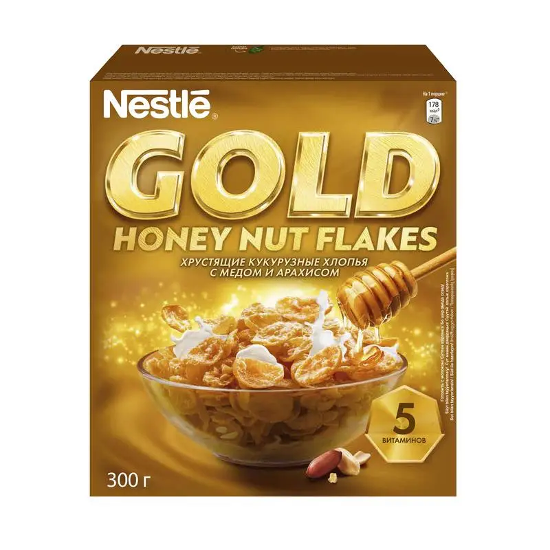 NESTLÉ GOLD Honey Nut Flakes. Хлопья кукурузные с медом и арахисом, обогащенные витаминами. 300 г