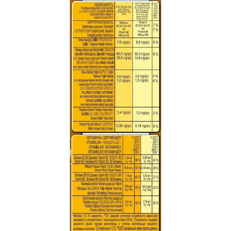 Готовый завтрак Nestle® Gold® Honey Nut Flakes — великолепное сочетание хрустящих хлопьев и золотистого меда с арахисом. И это именно тот случай, когда вкусное может быть одновременно полезным, ведь хлопья дополнительно обогащены витаминами. Одна порция готового завтрака покрывает более, чем на 15% суточную потребность организма в комплексе витаминов группы В, таких, как B2, B3 (ниацин), B5 (пантотеновая кислота), B6 и B9 (фолиевая кислота). Весомый аргумент, чтобы выбрать этот вариант завтрака для членов всей семьи. Детям и взрослым понравится сладость ароматных хлопьев, приготовленных из высококачественной кукурузной крупы. А натуральный мед и арахисовые орехи в составе превратят традиционный завтрак в аппетитный десерт.