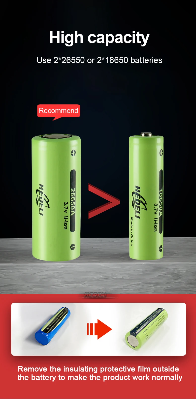 6. Используйте аккумуляторные батареи 2 * 18650 или 2 * 26650. Во внутренней проводке используется высокоэффективная повышающая цепь, чтобы максимально использовать батареи