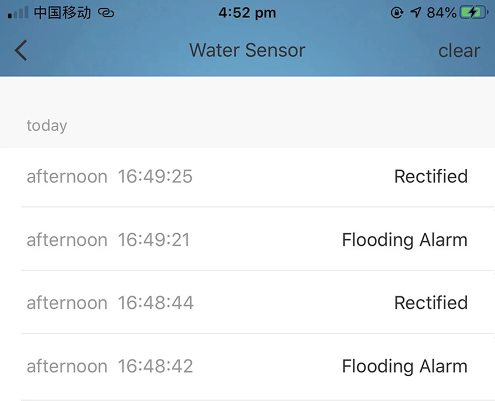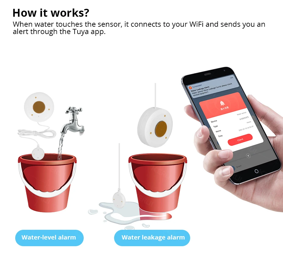 Когда детектор был погружен в воду, датчик будет звуковой сигнал, и уведомления о оповещении будут доставлены на ваш телефон. Вы можете быть в курсе переливания воды или достижения уровня воды, снижая риск затопления.