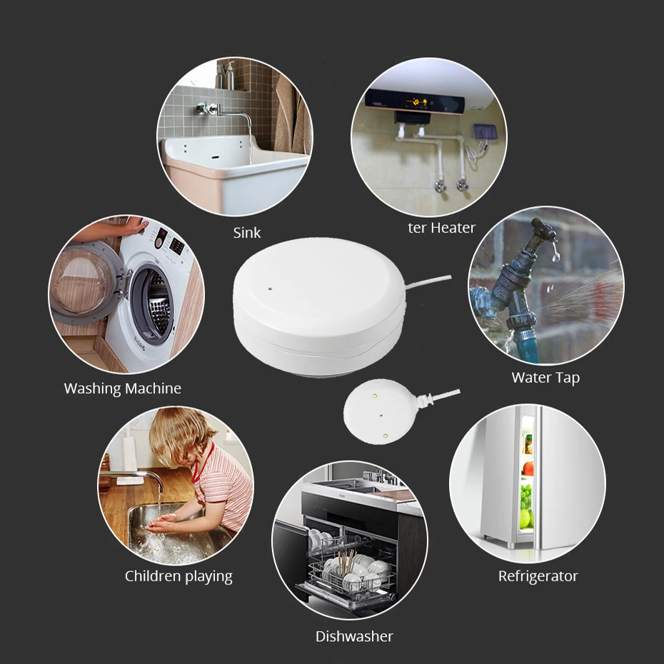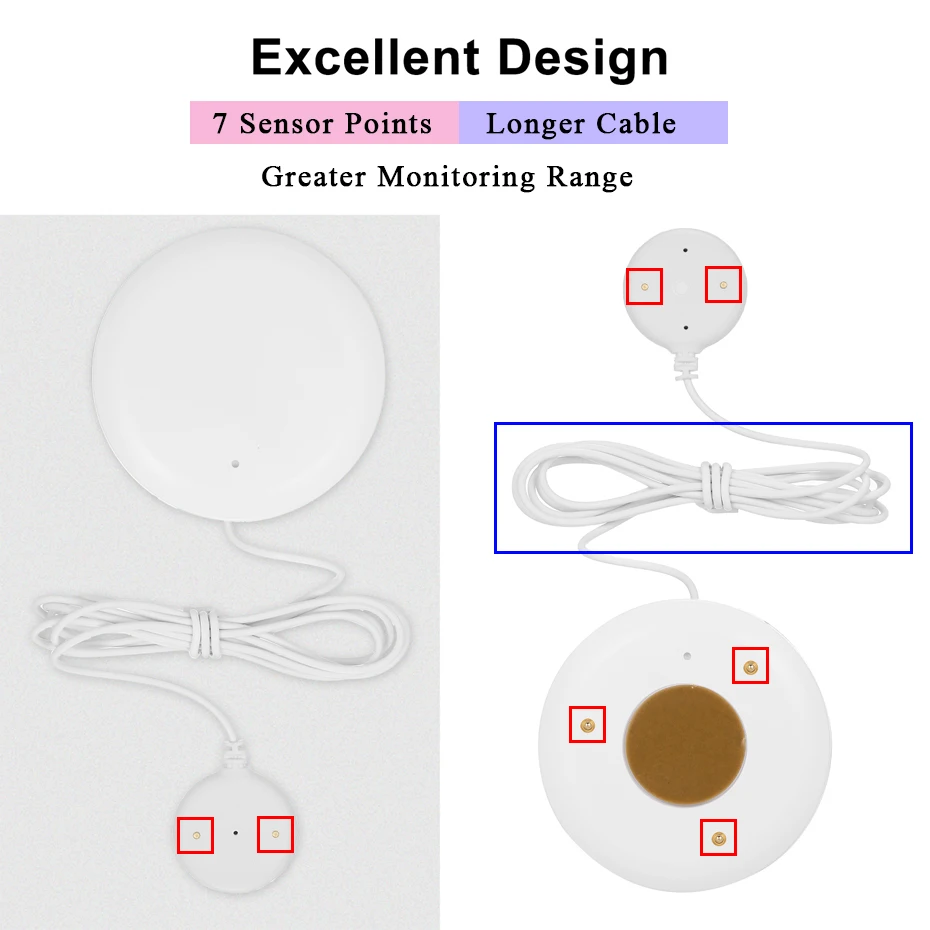 Усовершенствованная конструкция, больше сенсорных точек (7 точек), более длинный кабель, который может контролировать большую площадь. Идеальное предупреждение о вторжении воды в дома, квартиры (кухня, туалет), склады, офисы, лаборатории, гостиничные номера, гаражи и т. д.