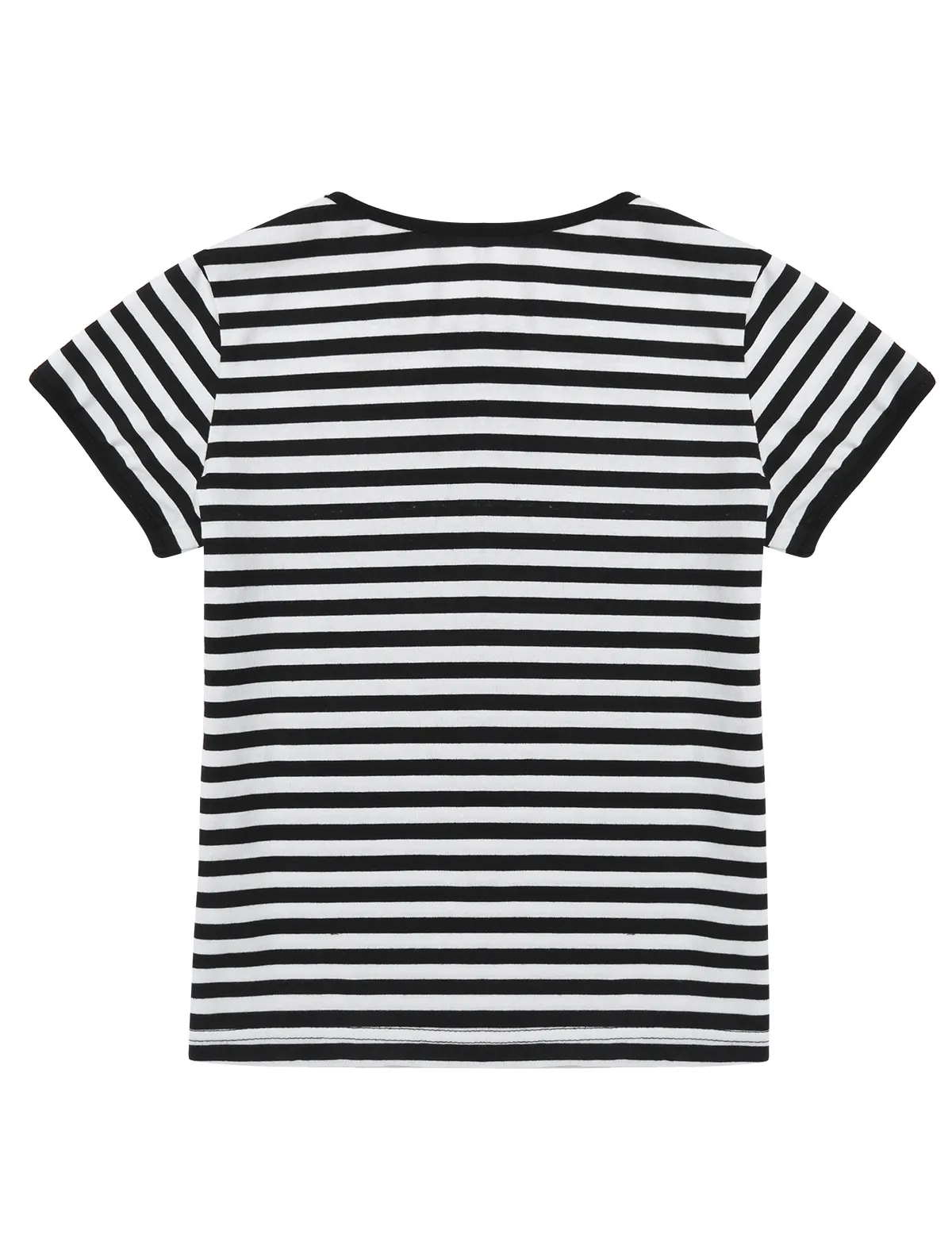 Short sleeves t-shirt, round neck, black & white striped design. Pull on closure.