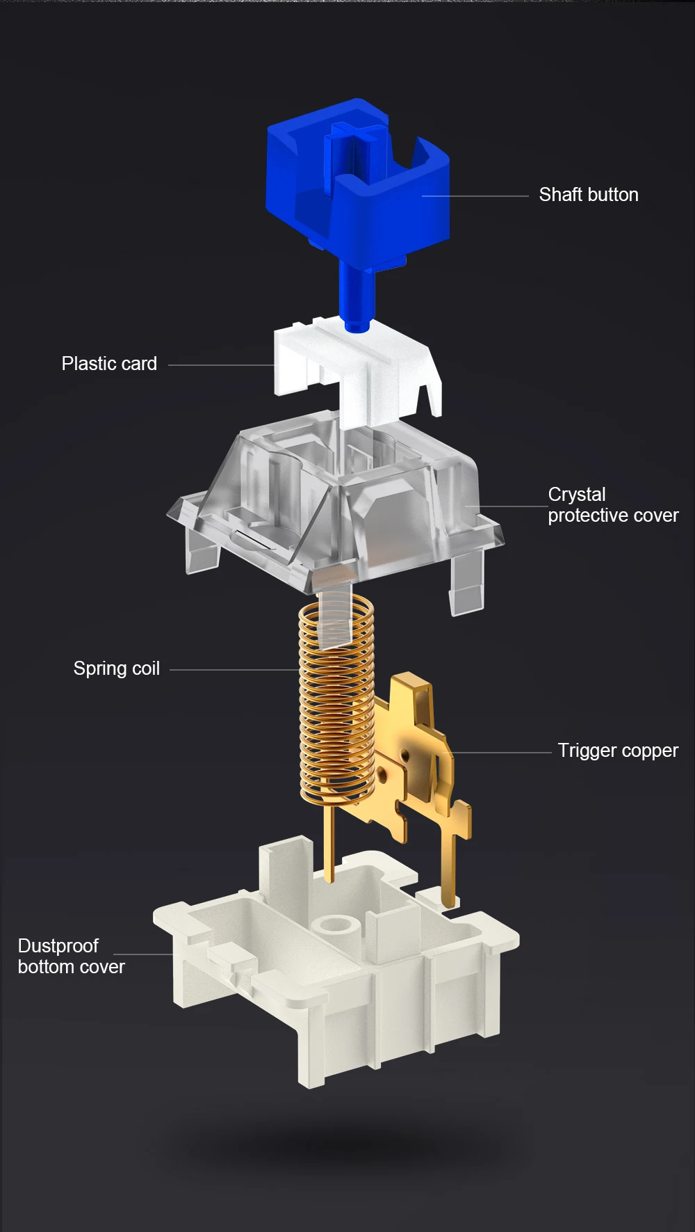 Описание: триггер быстрее, чем синий переключатель Outemu, звук четкий, триггер быстрее, и есть четкое ощущение прохода, это улучшенная версия синего выключателя Outemu.