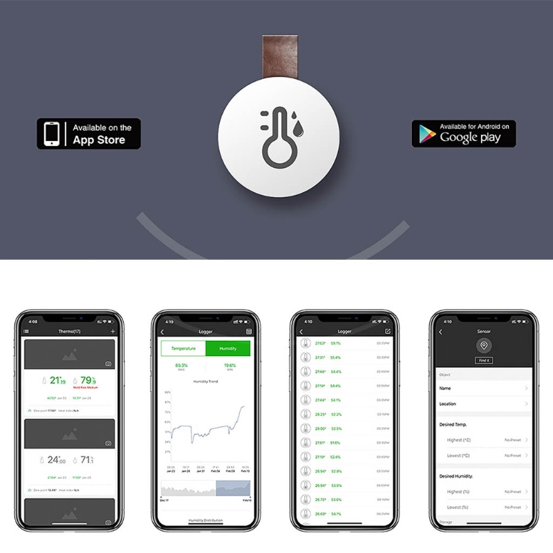 Тестер влажности может непрерывно контролировать и записывать данные о температуре и влажности в течение 10 минут, что удобно для записи, практично и удобно. С помощью кнопки батареи (входит в этот продукт) и технологии Bluetooth 5,0 с низкой энергией, тестер может поддерживать непрерывную работу в течение 100 дней.