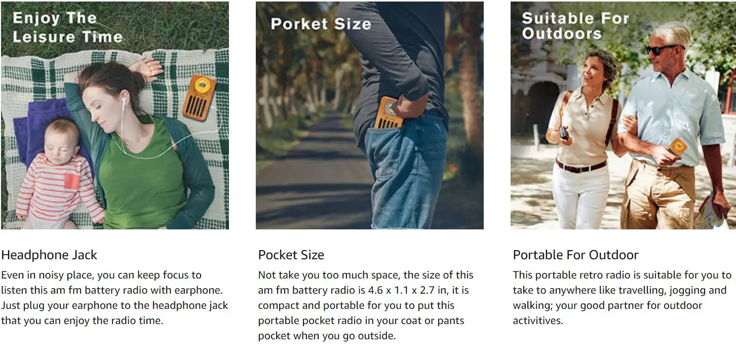【 Разъем для наушников 】 это карманное радио оснащает разъем для наушников, чтобы вы могли сосредоточиться на прослушивании музыки, новостей или спорта с помощью наушников даже в шумной обстановке. Более того, мы гарантируем 12-месячную гарантию, 30-дневный возврат денег и lifetim