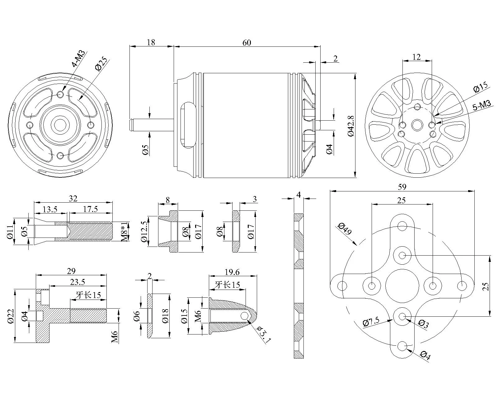 Крепление двигателя: 25*25 мм (М3*4)