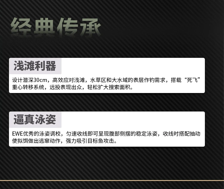 Designed for a diving depth of 30cm, it can effectively respond to the surface fishing needs of shallows, aquatic areas and large waters. It is equipped with a "dead fly" center of gravity transfer system, which has outstanding long-range projection performance and easily expands the search area.