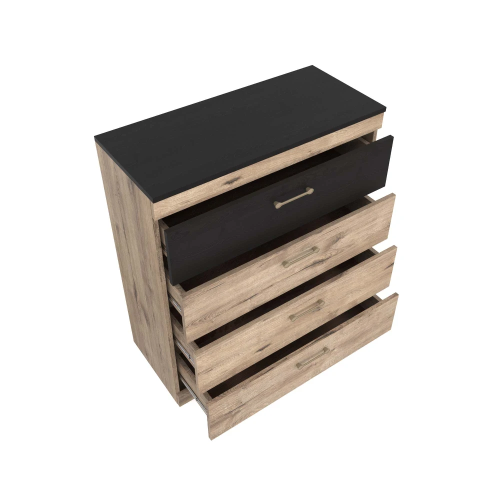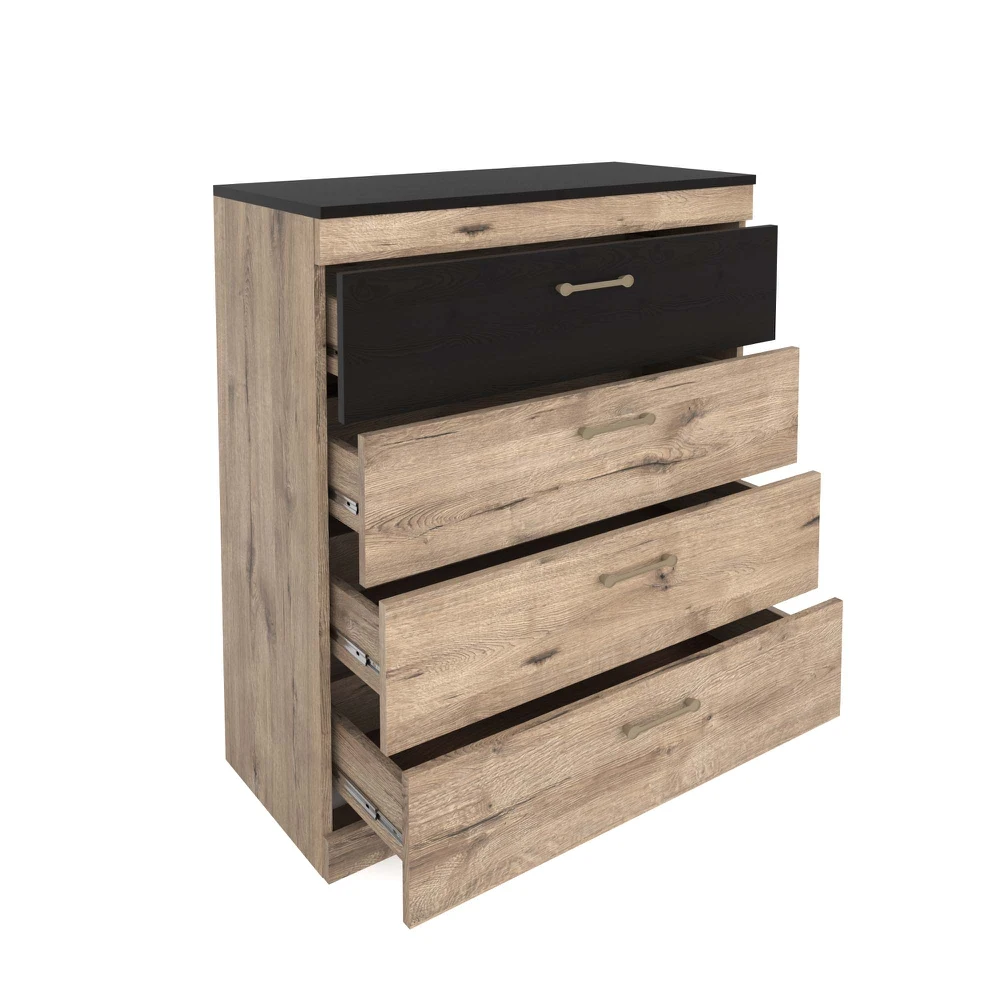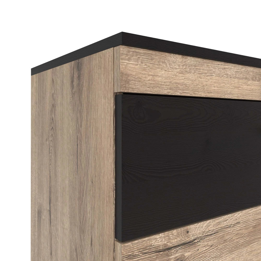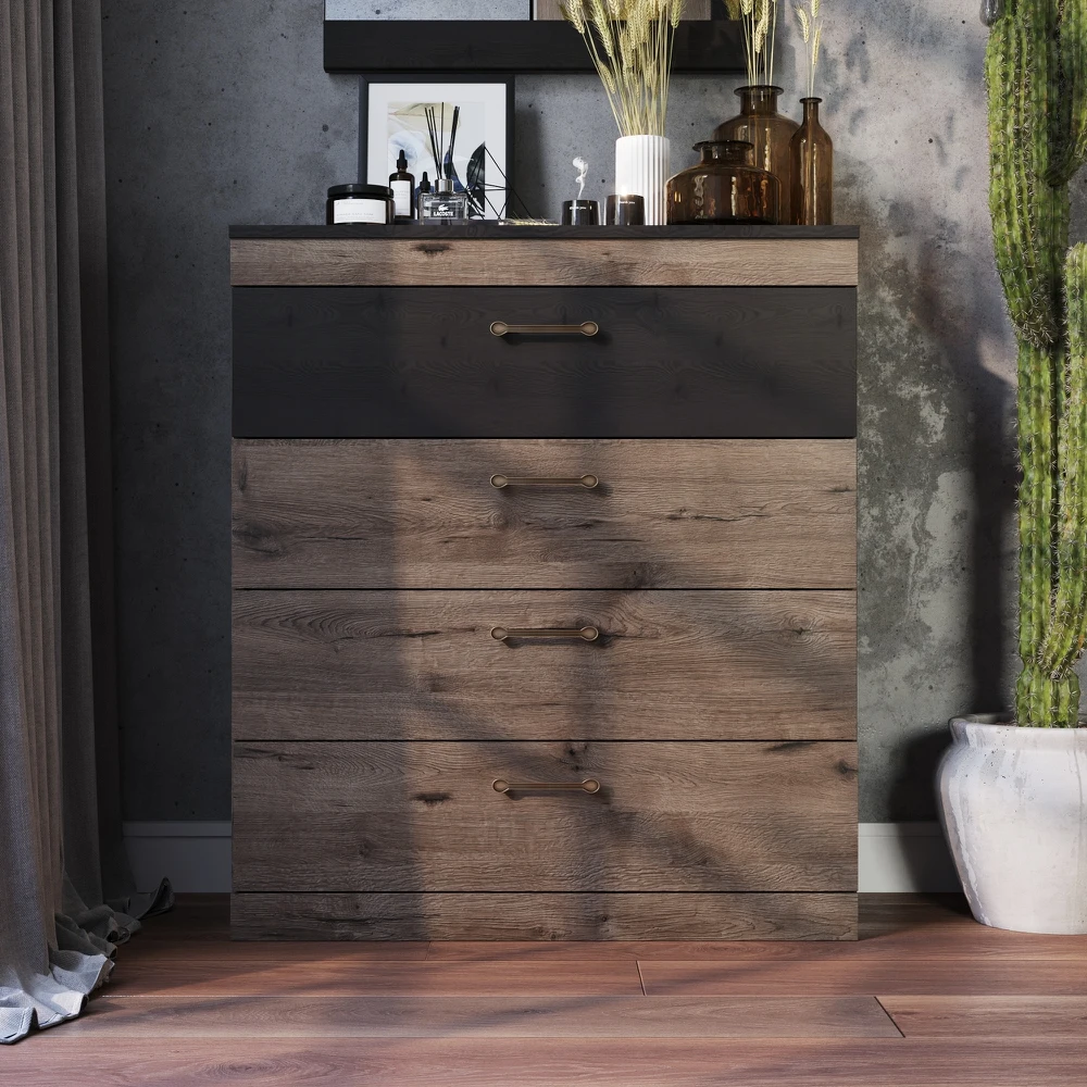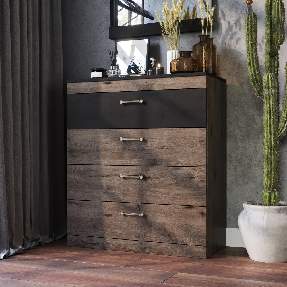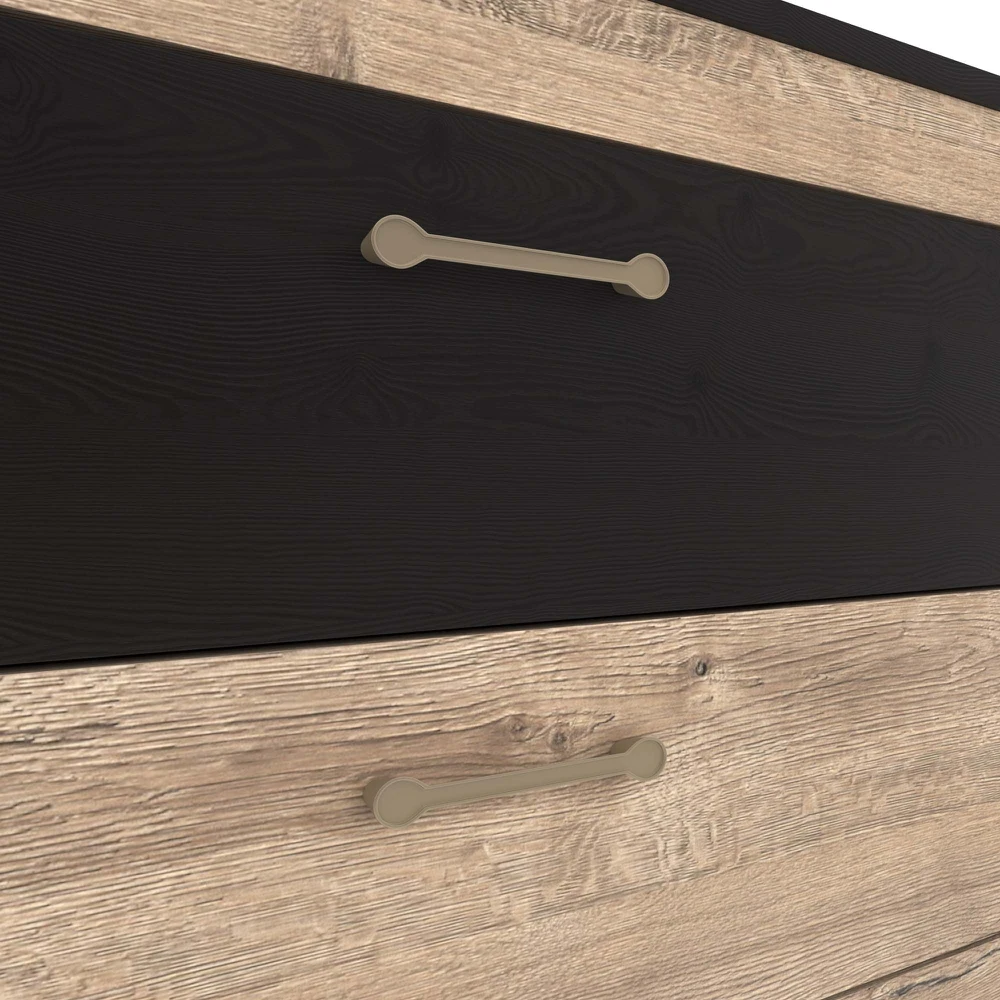 Комод «Дениз» с оригинальным сочетанием древесной текстуры и элементов чёрного цвета будет прекрасно смотреться в спальне в стиле лофт.