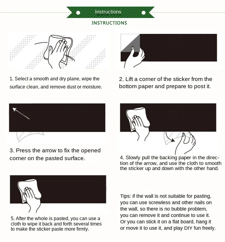 Метод клея: самоклеющийся и съемный. Использование: напишите мелом и протрите влажной тканью для лучшего эффекта