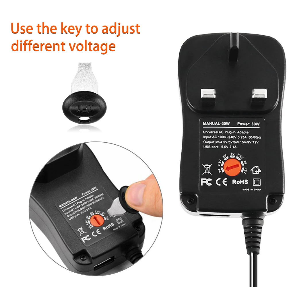 Универсальный адаптер питания 30W US/UK/AU/EU 3V 4,5 V 5V 6V 7,5 V 9V 12V AC DC зарядное устройство конвертер + 5V 2.1A USB порт с разъемом 8 шт AC Вход: 100-240V 0.25A 50/60Hz · DC Выход: 3V/4,5 V/5В/6В/7,5 в/9 В/12 · 8 подсказок адаптера.: · 5,5*2,5 мм · 5,5*2,1 мм · 4,0*1,7 мм · 3,5*1,35 мм · 3,0*1,1 мм · 2,5*0,7 мм · Разъем Micro USB-B · Светодиодный клеммный разъем. Что делает его подходит 95% переменного тока/DC (переменный/постоянный ток бытовая техника, как, например, 3V-12V бытовой электроники, планшет, PC, весы, Маршрутизаторы, колонки, Светодиодные ленты огни, CCTV Камера системы usb-камера для зарядки и так далее. Примечание:Адаптер переменного тока не равен зарядному устройству; Пожалуйста, выключите устройства аккумулятора, когда он заряжается и не заряжайте его в течение более определенного времени зарядки. Перед подачей заявки, пожалуйста, внимательно проверьте votage и коннектор. Спасибо. В то же время имеется 5,0 V 2. С силой тока 1 а на Вход разъем) и микро USB штекер в комплекте, так что это 30 Вт AC адаптер идеально подходит для зарядки колонки, камеру и другие устройства. Посылка включает в себя: 1x Универсальный адаптер питания 30 Вт 8 наконечников постоянного тока (в комплект входит маленький ключ) Для выбора напряжения, вы можете настроить его с помощью предоставленной кнопки!