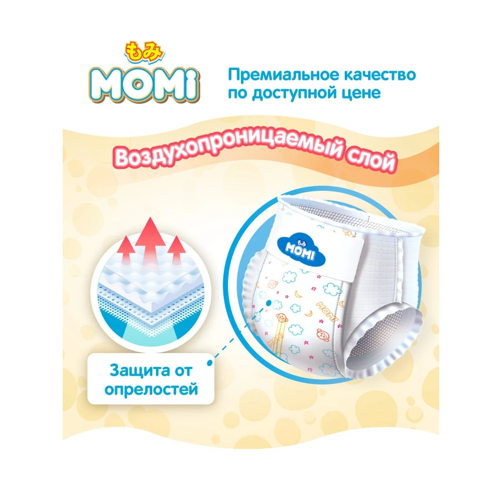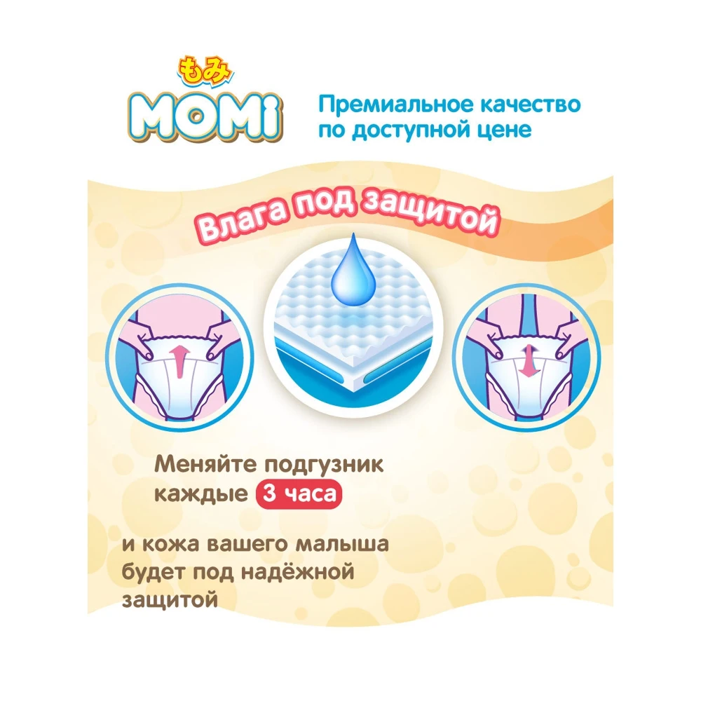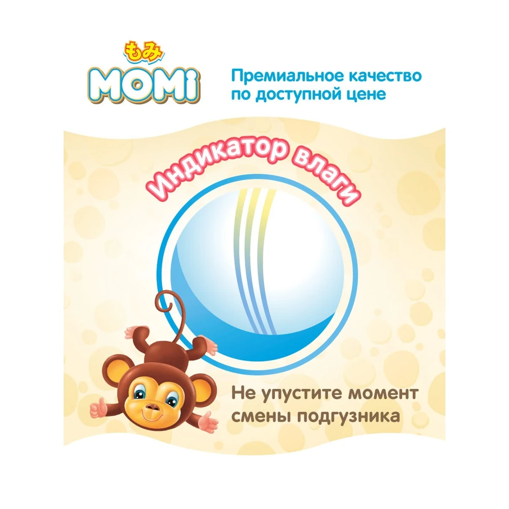 Подгузники Momi Ultra Care - это абсолютно новые подгузники, отвечающая всем требованиям современных мам, имеют знак качества экологичности ЭКО, что подтверждено сертификатом и рекомендованы дерматологами. В изготовлении подгузников используется инновационные гипоаллергенные материалы, которые быстро впитывают и удерживают влагу, поддерживая сухость до 12 часов. Эластичный поясок мягко и плотно облегает талию малыша, препятствует подтеканию жидкости вдоль спины. Новый супер дышащий нижний слой быстро распределяет влагу внутри и не дает ей слеживаться, а 3D поверхность защищает нежную кожу малыша от возникновения раздражений, оставляя ее сухой и чистой. Благодаря индикатору наполнения легко понять, когда пришло время менять подгузник.