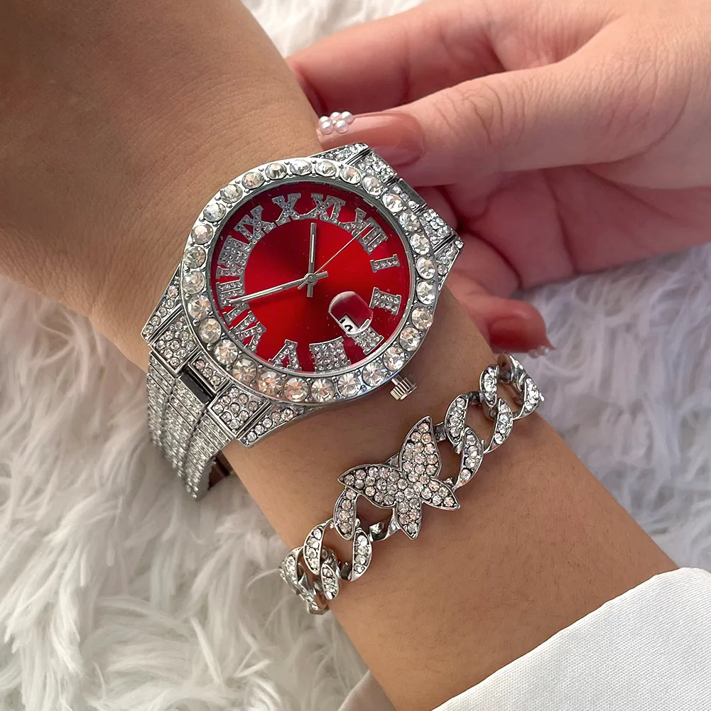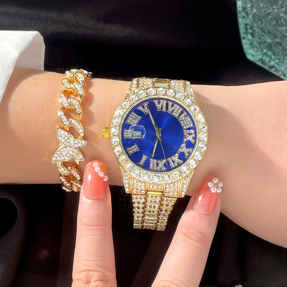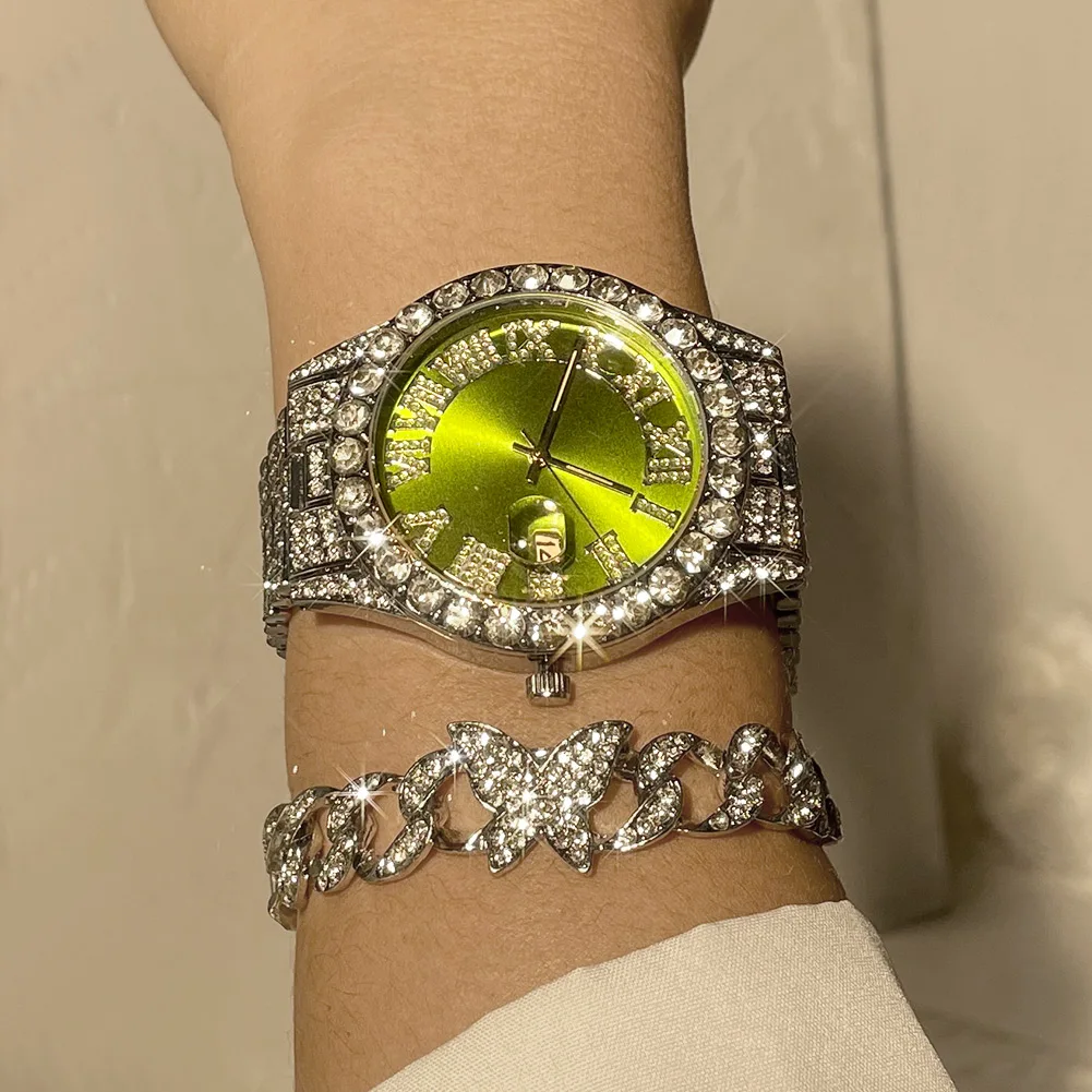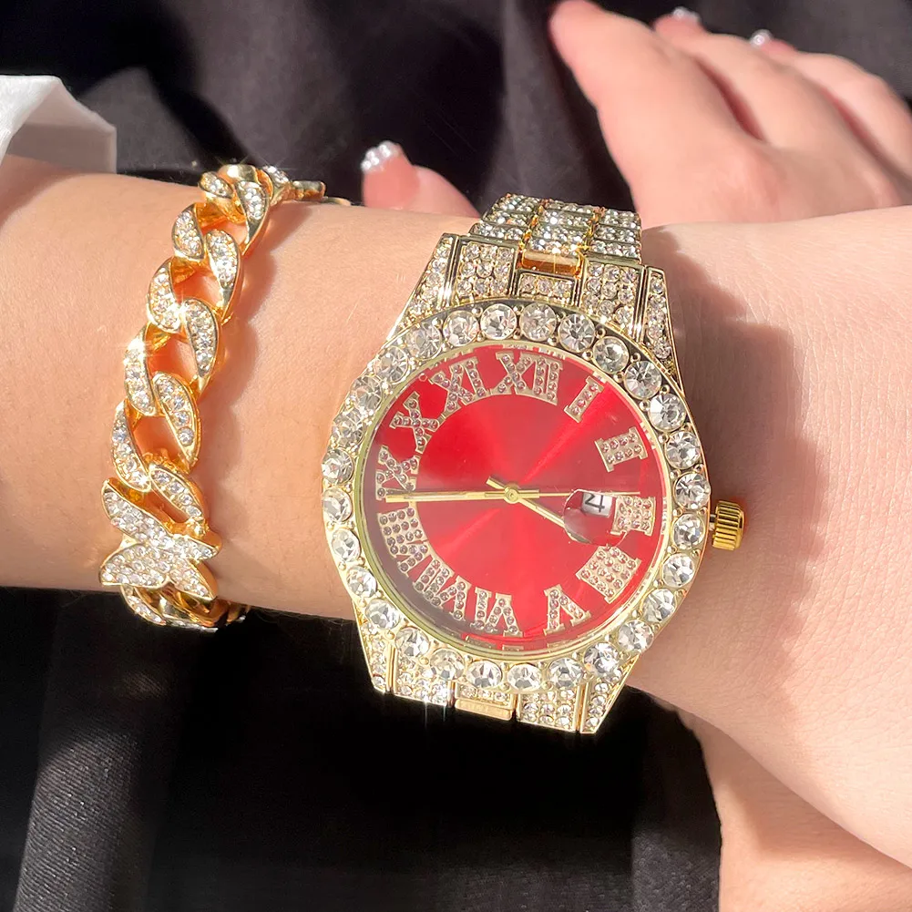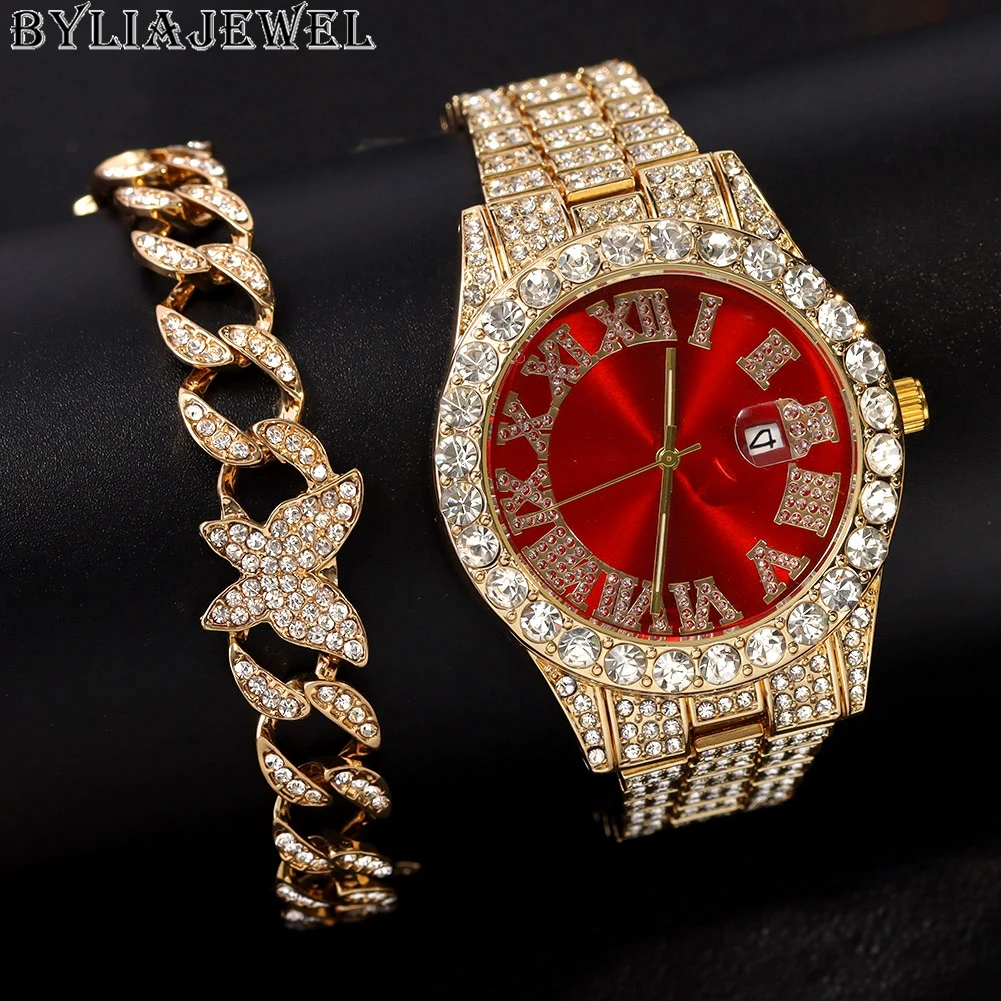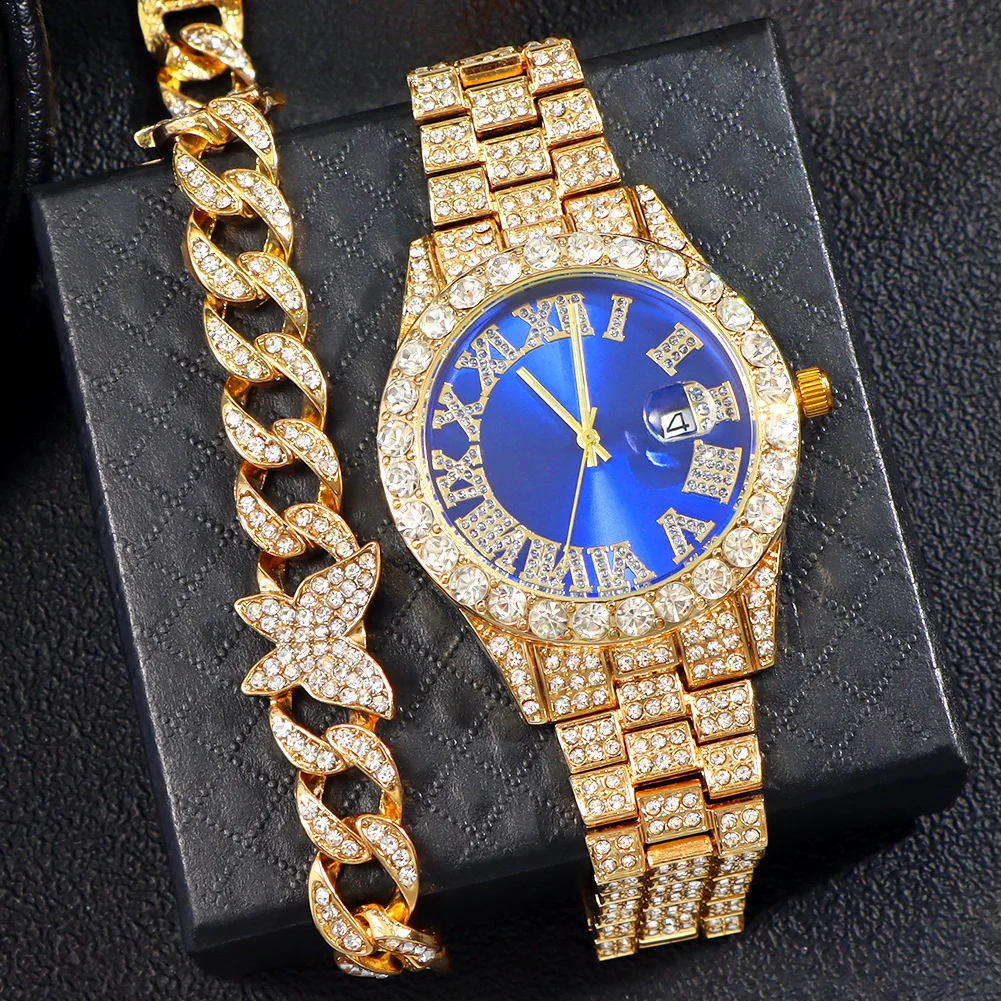 Льдом цепи часы-браслет для Для мужчин со льдом часы комплект ювелирных изделий в