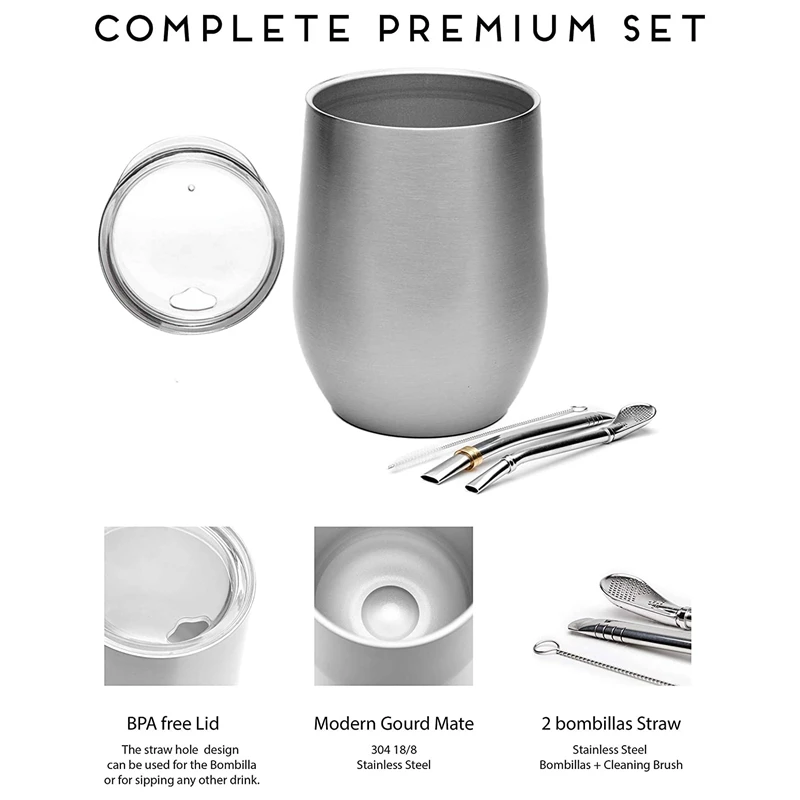 Yerba Mate Gourd Tea Cup Set 12Oz,Double-Wall Stainless Coffee Water Cup with Lid 2 Bombillas Straws Spoon&Brush