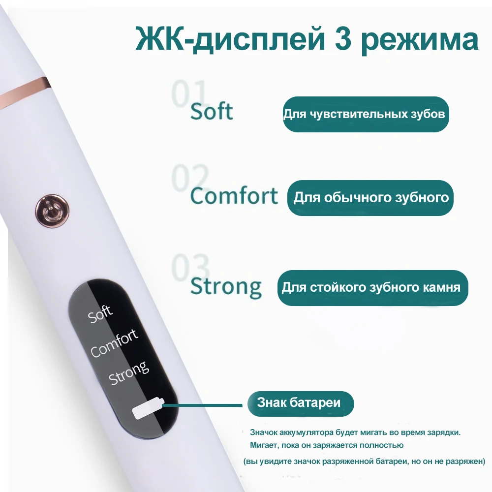 1. Очиститель зубов принимается с помощью высокочастотной вибрации, с рабочей частотой до 200 миллионов раз в минуту. В сочетании с наконечником профессионального очистителя, он эффективен в удалении упрямых пятен и зубного камня.