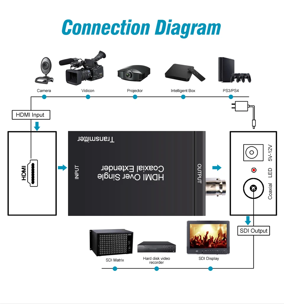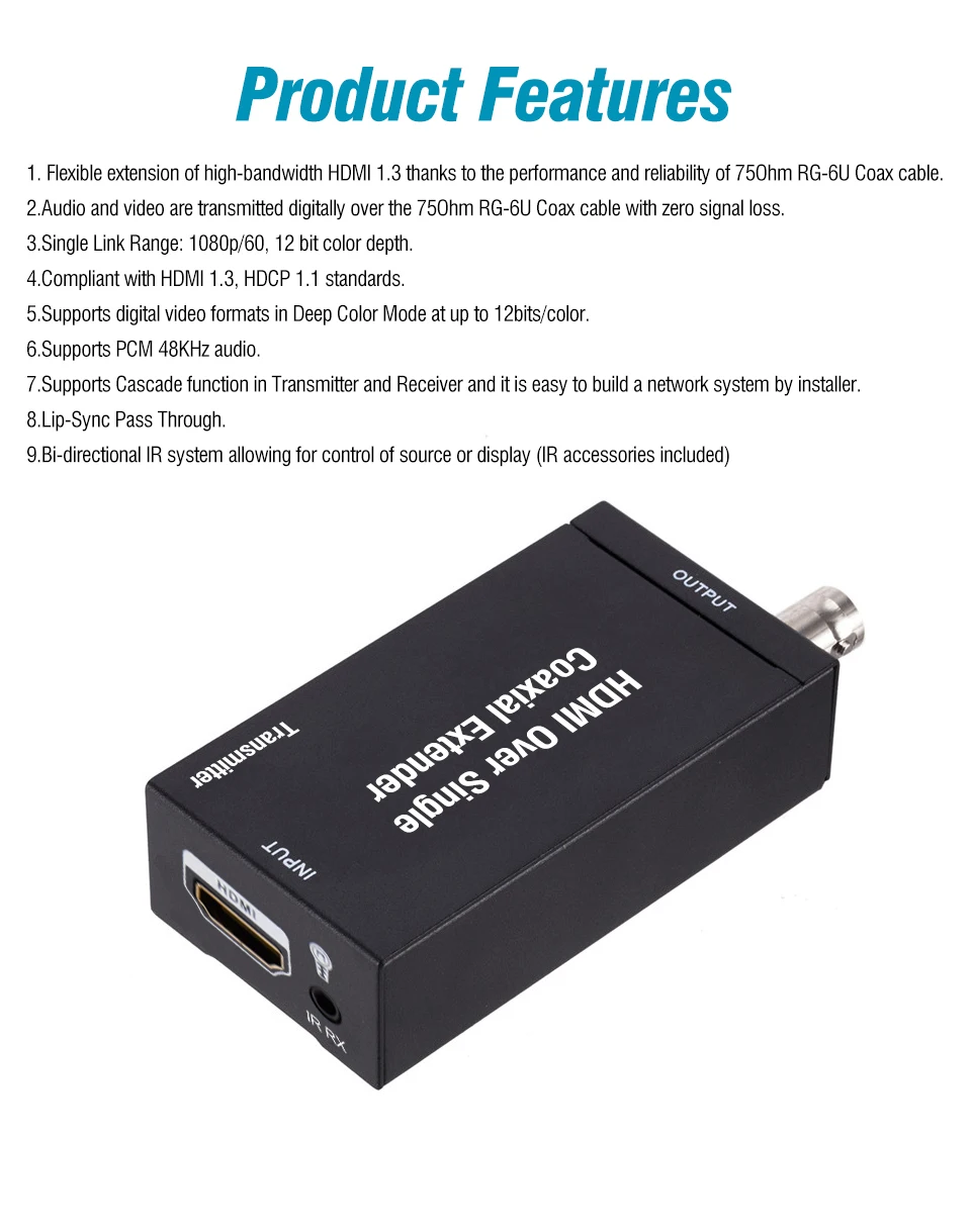 HDMI через один коаксиальный кабель удлинитель посылает сигналы HDMI через коаксиальный кабель 75 Ом-до 100 метров. HDMI через один коаксиальный удлинитель поддерживает HDMI 1,3 и HDCP 1,1, с такими функциями, как глубокий цвет и 1080p. Используя стандартный и широко доступный кабель 75 Ом RG-6U, HDMI через один коаксиальный кабель удлинитель позволяет HDMI сигнал увеличить пропорцию и является дорогим. Медные кабели прочнее оптических волокон. Расширитель состоит из двух единиц: передатчика и приемника. Устройство отправки используется для сбора входного сигнала HDMI и передачи сигнала через коаксиальный кабель. Приемный блок отвечает за выравнивание передаваемого сигнала HDMI и восстановление ИК и последовательных сигналов управления. Расширитель обеспечивает наиболее удобное решение для одного расширения HDMI. Кабель ecoaxial имеет дальние возможности и является идеальным решением для любого применения.