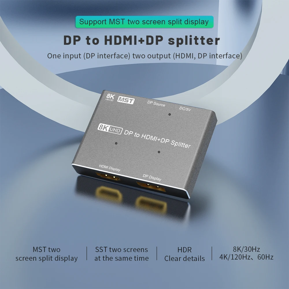Displayport 1,4 to HDMI-Совместимость8K Display Port 1,4 8K Splitter, этот сплиттер displayport позволяет подключаться от одного источника DP к одному DP Display и одному HDMI-СовместимостьДисплей, только 1 дюйм 2 дюйма. (Два дисплея могут отображаться одновременно), вы должны использовать usb-кабель для питания сплиттера, или ваш дисплей не может ничего показать, *** не двунаправленный переключатель, он не может работать от одного источника dp и HDMI-СовместимостьИсточник на один дисплей dp