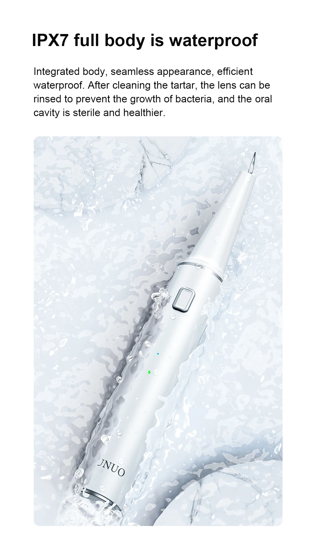 Интегрированный корпус, бесшовный внешний вид, эффективный водонепроницаемый. После очистки зубного камня линзу можно промыть, чтобы предотвратить рост бактерий, а полость рта стерильна и безопасна для здоровья.