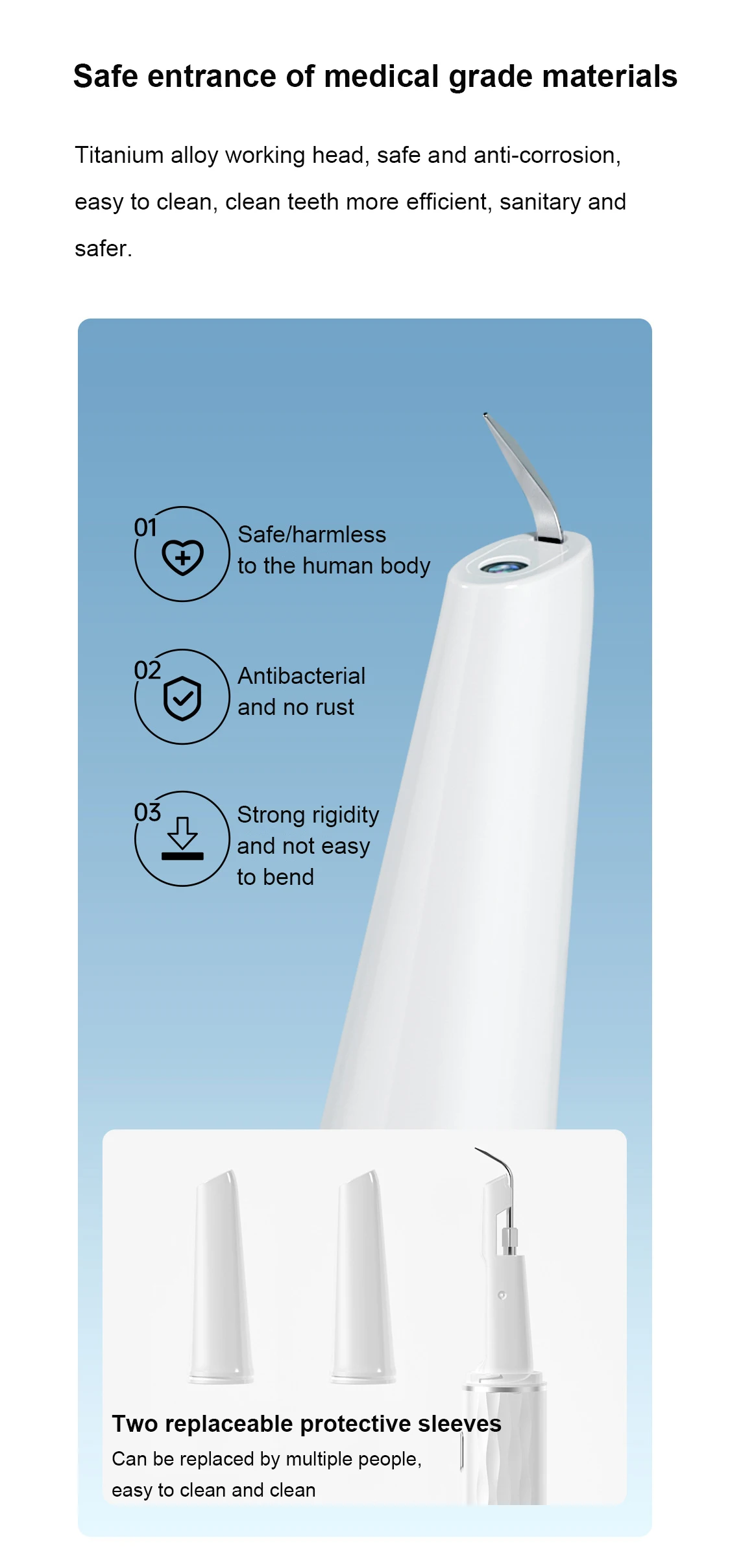 Рабочая головка из титанового сплава, безопасная и антикоррозийная, легко моется, чистит зубы более эффективно, гигиенично и безопасно.