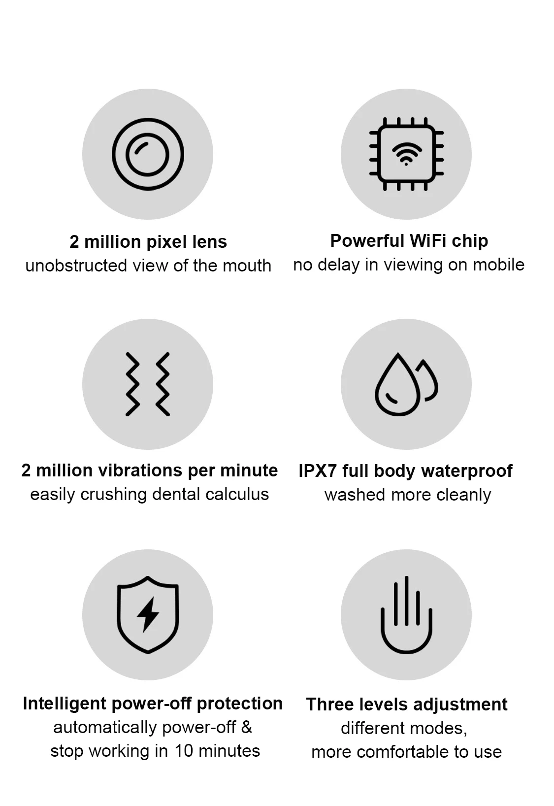 Встроенный четырехосевой направленный гироскоп, угол обзора камеры остается неизменным, точная Очистка зубов на 360 °, что обеспечивает безопасную и удобную очистку зубов высокого класса.