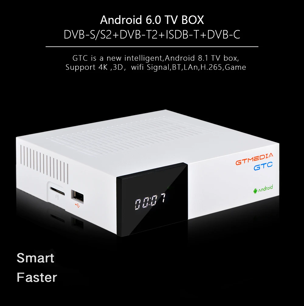 Если ваш почтовый индекс Испании 35,38,51,52,70,90 Области, пожалуйста, пришлите нам свой номер NIF, это ваше местное требование, спасибо. Характеристики светодиодных лент: 1. 【Android TV BOX + DVB-S/S2,DVB + T/T2/кабель 】 : GTC BOX с четырехъядерным процессором Amlogic S905D ARM Cortex-A53 технология работает более стабильно и быстрее. И совместимость с новейшими приложениями Android, такими как YouTube, Netflix И т. д. DVB-S2 & T2 & cabe & ISDB-T четыре в одном (высокая эффективность кодирования видео), поддержка Ccamd, Newcamd, Mgcamd; 2. 【Поддержка Full PowerVu, DRE & Biss key】 3.【 4K 60 кадров в секунду/3D/H.265/MPEG-4 поддержка фильмов : Он поддерживает 4k 60fps, позволяет наслаждаться высоким разрешением, высокой четкости STB декодер 4. 【 Встроенный Wifi 2,4G + BT4.0 】 : Он имеет встроенный WIFI модуль, нет необходимости покупать WIFI антенну отдельно. Мы предлагаем удобное подключение и более стабильный Wi-Fi сигнал для отличного видео опыта. Поддержка Bluetooth 4,0 для подключения клавиатуры, мыши, наушников, динамиков и других устройств Bluetooth, чтобы разблокировать больше игр. 5. 【GTUI】 : Красочный и простой дизайн и простая в использовании операционная система, минималистическое меню, ярлык на рабочем столе, независимое воспроизведение небольших окон, быстрый доступ к вашей любимой программе. Подарите вам более комфортное визуальное удовольствие 6. 【GTplayer】 GTC имеет встроенный GTplayer, который поддерживает 1P TV,M3U,Xtream,5talker. Позволяет управлять вашей учетной записью телевизора более просто и эффективно Примечание: Это только коробка, без учётной записи Рождественская фотография:Смотрите так же другие товары: