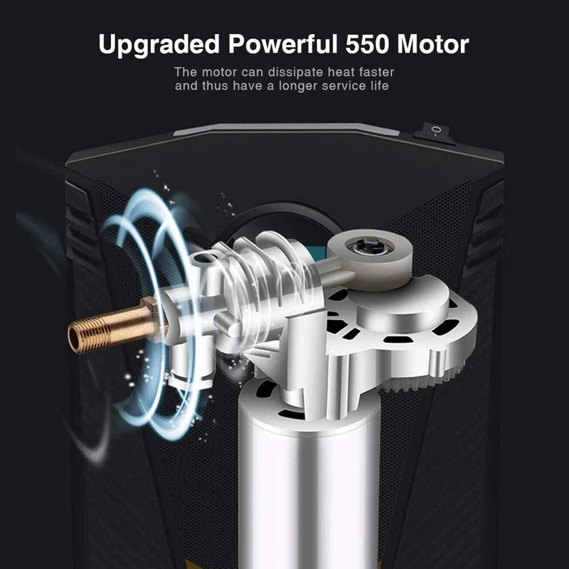 [Автоматическое отключение накачки шин] Автомобильный воздушный компрессор автоматически отключается, как только Накачка шин достигнет необходимого давления. Подключается прямо в гнездо постоянного тока 12 В (прикуриватель), для легкого обслуживания шин вне дома или в дороге. Затем прочитайте и установите давление с цифровым индикацией, начните накачивать, он автоматически отключится при достижении заданного давления.