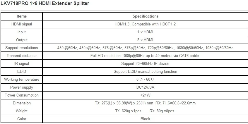 Этот HDMI-совместимый разветвитель расширителя работает с 8 HDMI-совместимыми приемниками расширителя CAT6 для разделения и расширения 1 HDMI-совместимого источника на 8 HDMI-совместимых дисплеев по одному кабелю CAT6/6a/7 до 40 м/131 фут. Максимальное Поддерживаемое разрешение составляет 1920x1080 при 60 Гц, и оно поддерживает ИК-передачу, проход EDID и требуется только один адаптер питания для передатчика, приемник питается от передатчика по кабелю CAT6. Идеальное решение для ХДМИ-совместимого центра выставки, видеоконференции и шоу, ект.