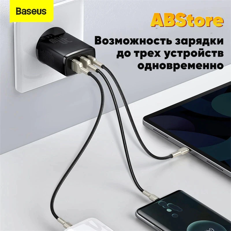 Сетевое зарядное устройство мощностью 30 Вт с тремя разъёмами для одновременной зарядки 3-х устройств. Type-C поддерживает до 30 Вт, USB-А до 18 Вт, при подключении 2-х / 3-х устройств общие выходные параметры составляют 5В 3А