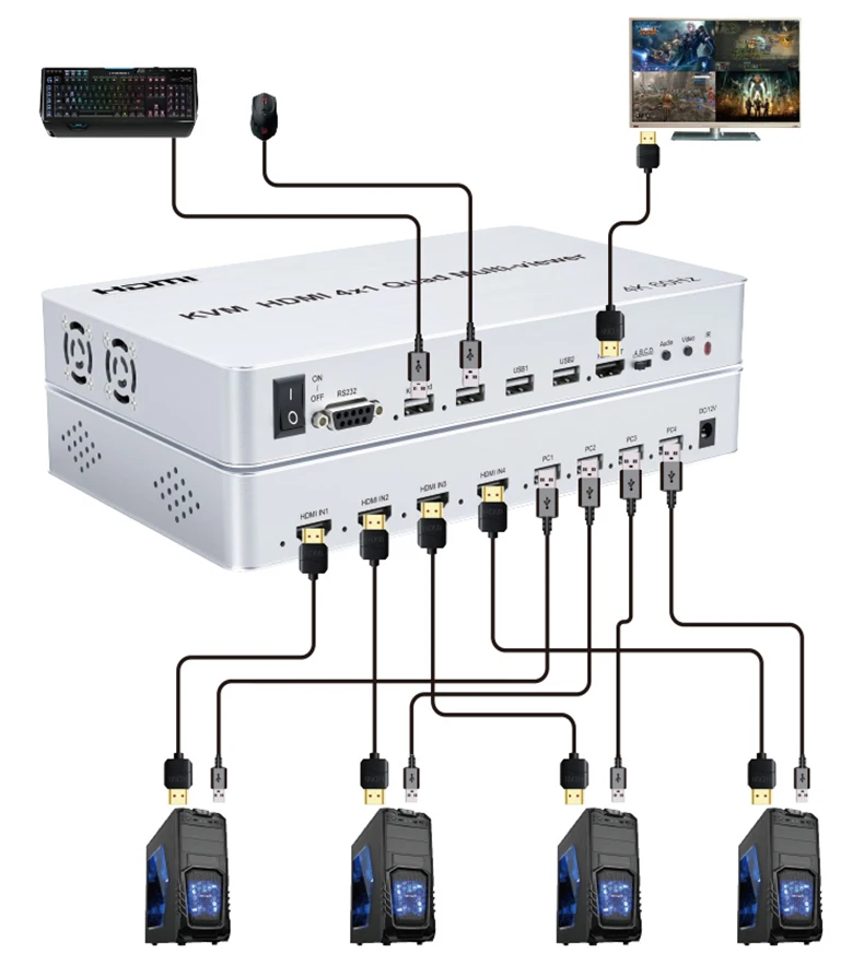 Этот мульти-просмотра KVM HDMI поддерживает функцию HDMI KVM. Вы можете управлять до 4 ПК или ноутбуков с одним набором keybpard и мыши.