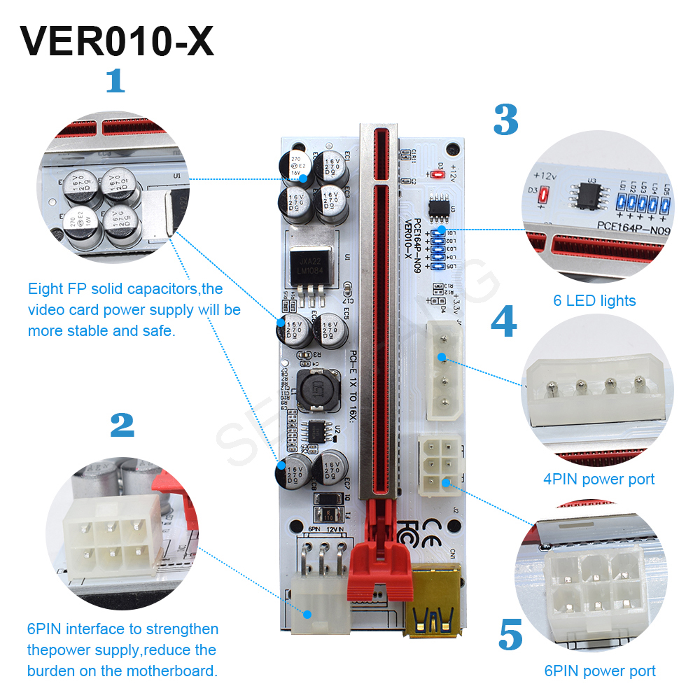 2: карта адаптера имеет 6-контактный интерфейс и 12 В Улучшенный источник питания постоянного тока, чтобы сделать питание видеокарты независимым от материнской платы, тем самым уменьшая нагрузку на материнскую плату при подключении нескольких графических карт.