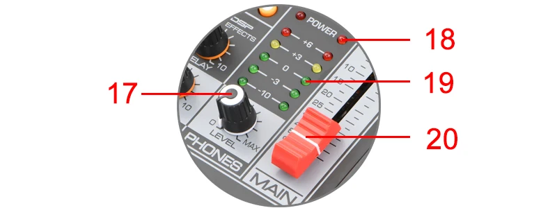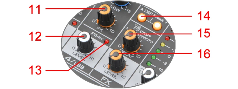 11. [FX] КонтроллерА. Отрегулируйте уровень сигнала от канала к линии реверберацииB. Обратите внимание, что уровень сигнала будет отличаться в зависимости от настроек аттенюатора каналаC. При использовании стереофонического канала, будут смешивать сигналы от L и R каналов, затем, отправить его на линии реверберации12. [Уровень] контроллерНастройте, чтобы сбалансировать громкость каждого канала13. [Пик] светодиодный светильникA. Когда громкость входного сигнала или громкости после регулировки эквалайзера слишком высока, светодиодный светильник индикатора будет мигатьB. Поверните ТРОЛЛЕР против часовой стрелки, чтобы уменьшить громкость14. [Выбор DSP]Можно сделать с цифровыми эффектами (зал, комната, реверберация и т. Д. См. Список эффектов на поверхности смесителя). Или, только задержка с 16 регулировкой уровня15. [Задержка] КонтроллерОтрегулируйте глубину реверберации16. [FX LEVEL] эффекты возвращаются к контроллеру уровняОтрегулируйте громкость эффекта