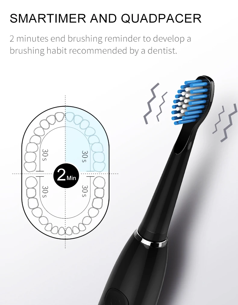 2. Помощь научная Чистка привычка: 30 s + 2mins умный таймер, в ручке таймер импульсов каждые 30 секунд, чтобы сообщить вам, когда переключать области рта, 2 минуты напоминания о конце чистки для развития привычки чистки, рекомендованной стоматологом (один из них предлагает лучший период чистки)