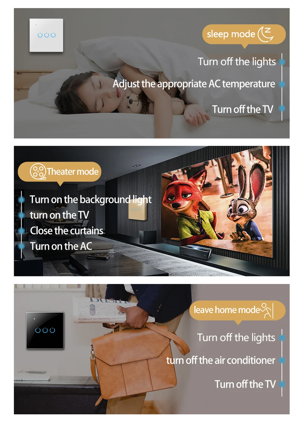 Настенный выключатель изготовлен из высококачественных материалов, таких как огнестойкая оболочка, медные разъемы с фосфором и передовое PC + закаленное стекло, может обеспечить защиту от огня, перегрузки для защиты вашей семьи. Все наши продукты сертифицированы CE и RoHS. Без использования каких-либо вредных химических веществ, пожалуйста, расслабьтесь в использовании.