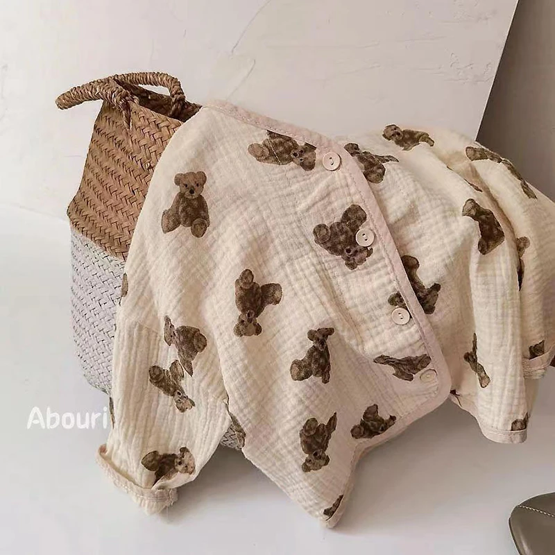 Рисунок с милым медведем, кардиган для маленьких мальчиков и девочек, рубашки весенне-летние льняные хлопковые куртки для малышей повседневное пальто для малышей Топы для детей