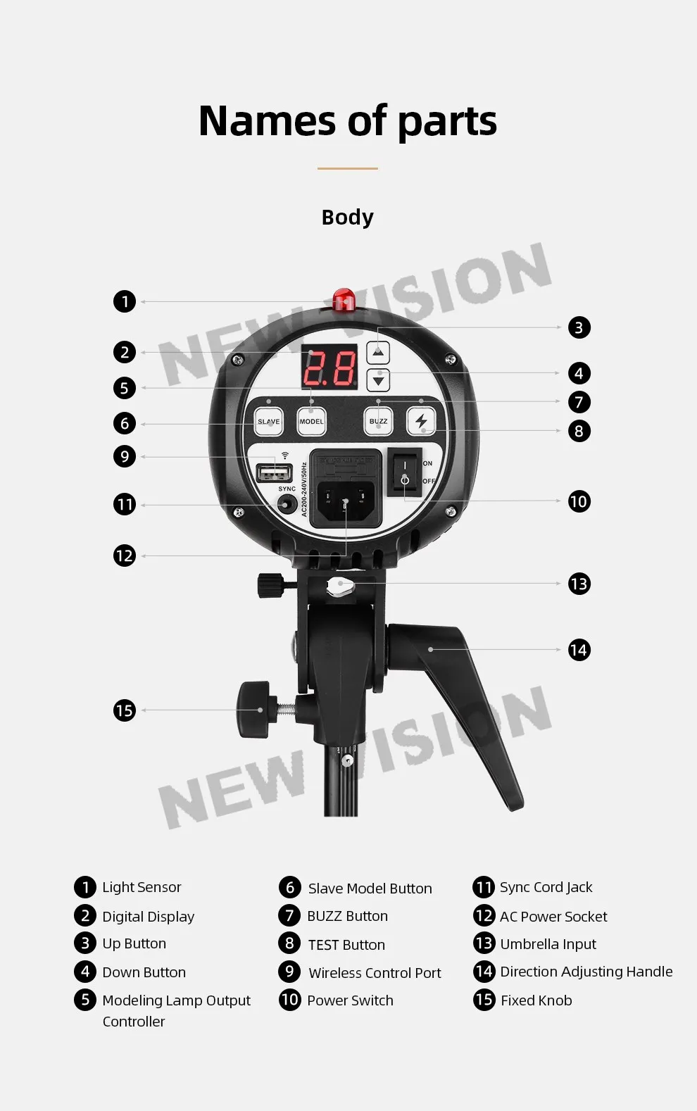 Размеры | Диаметр вспышки 11.11,8 см, высота вспышки с ручкой 20 см, длина вспышки с моделирующей лампой 20,3 см | |||