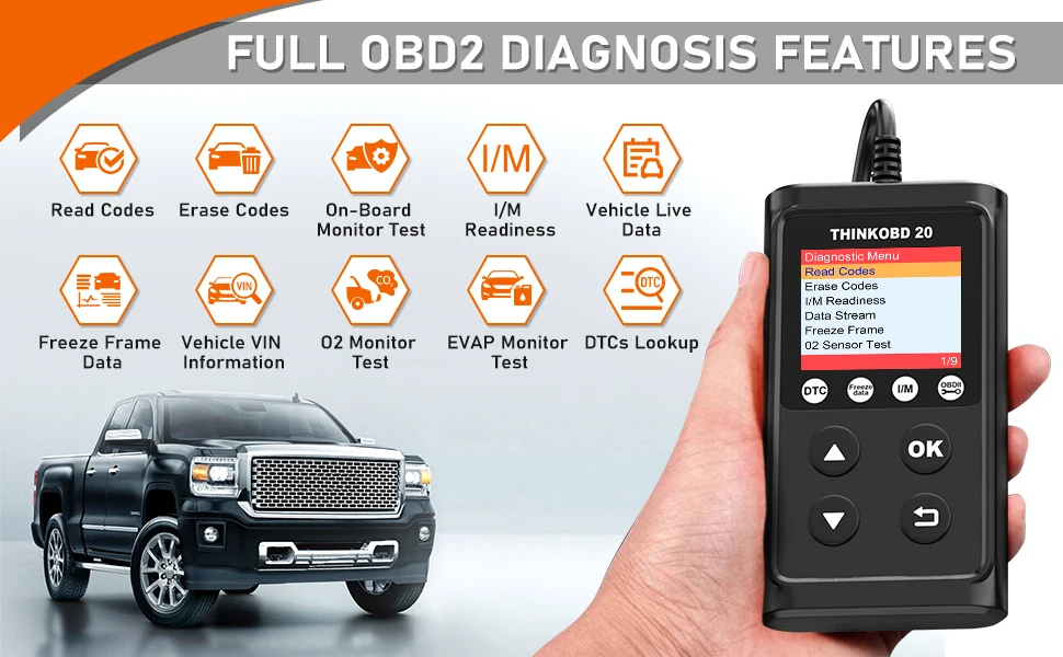 THINKOBD 20, с полным 10 режимами функций OBD2, DTC Lookup, 1,77 ''LCD цветной дисплей. Это действительно отличный считыватель кодов OBD2, который вы должны держать в своих автомобилях как кусок стандартного оборудования. Это позволяет DIYers и механикам сделать Smog тесты и решить основные проблемы двигателя и выбросов.