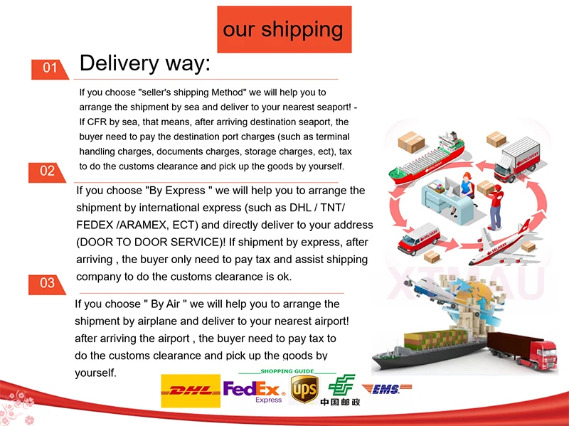 2. Если вы выберете «экспресс», мы поможем вам организовать доставку международной экспресс-почтой (например, DHL / TNT/ FEDEX /ARAMEX и т. Д.) И непосредственно доставляем по вашему адресу (от двери до двери)! При отправке экспресс-почтой, после прибытия, покупатель должен только оплатить налог и помочь транспортной компании, чтобы сделать таможенное оформление в порядке.