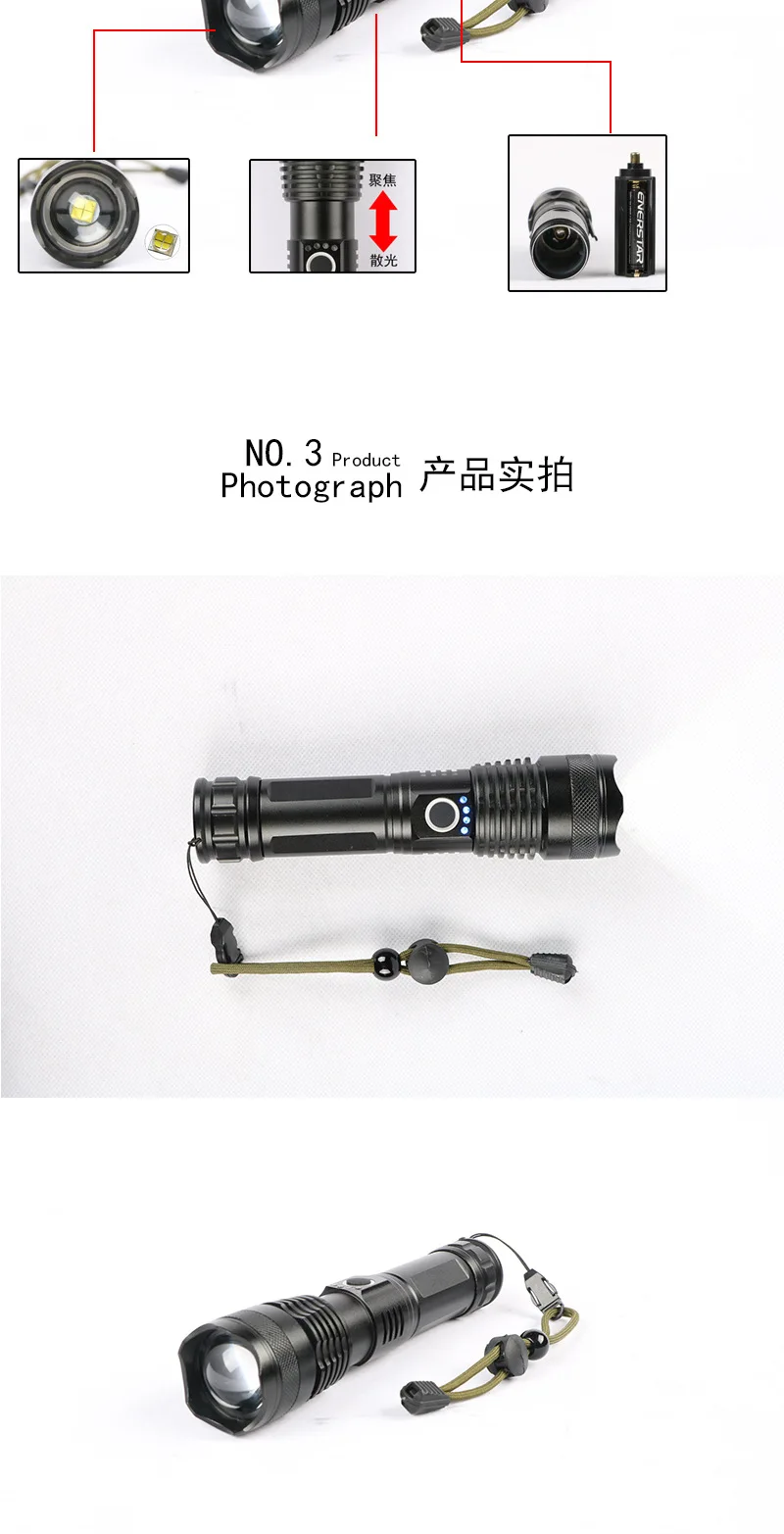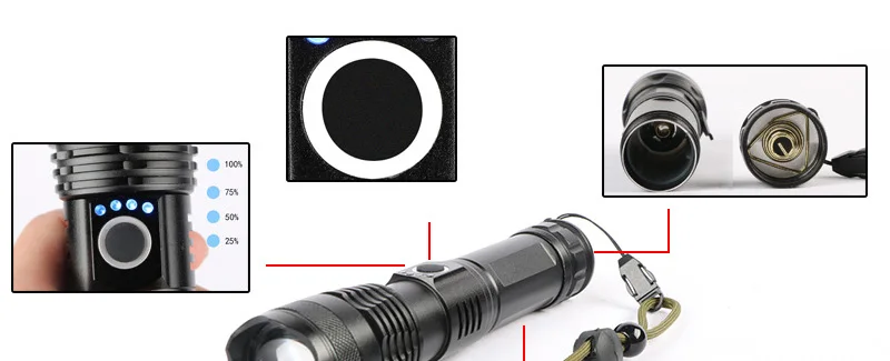 6. Функция продукта: телескопический зум-объектив, пять режимов (сильный свет-средний свет-нижний свет-вспышка SOS) переключатель часть спроектирована с 4 ЖК-экран с индикатором зарядки (100%-75%-50%-25% мощности), при зарядке 4LED индикатор питания мигает в следующем порядке: И 4LED мощность индикатор горит постоянно при достижении уровня полной зарядки станет гореть. Фонарик плата предназначена с: батарея анти-защита от обратной связи, защита от перезаряда и переразряда. Usb-кабель для зарядки.