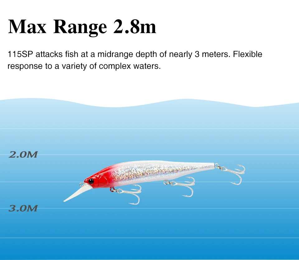 NYX 115S может атаковать рыбу на средней глубине около 3 метров. Эта приманка обеспечивает максимальную «похожую на приманку», производя динамические дартс и стимулируя вибрации. Независимо от того, атакуете рыбу от внезапных капель, высоких волн, скал или лодок, NYX подходит к голодным морским кругам