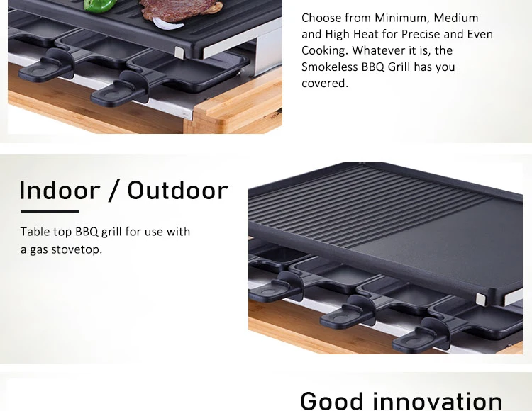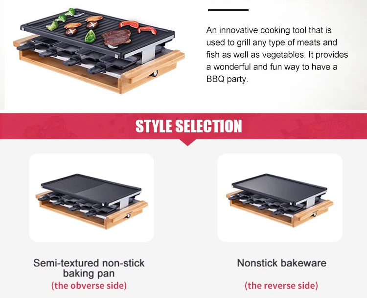 • 【 8 человек party】более того, не так много нужно для успешного вечера raclette, только нужно наш электрический гриль, разложить различные ингредиенты на столе, пригласить друзей и вечер может начать. До восьми человек могут использовать три функции гриля одновременно благодаря нашим 8 кастрюлям.