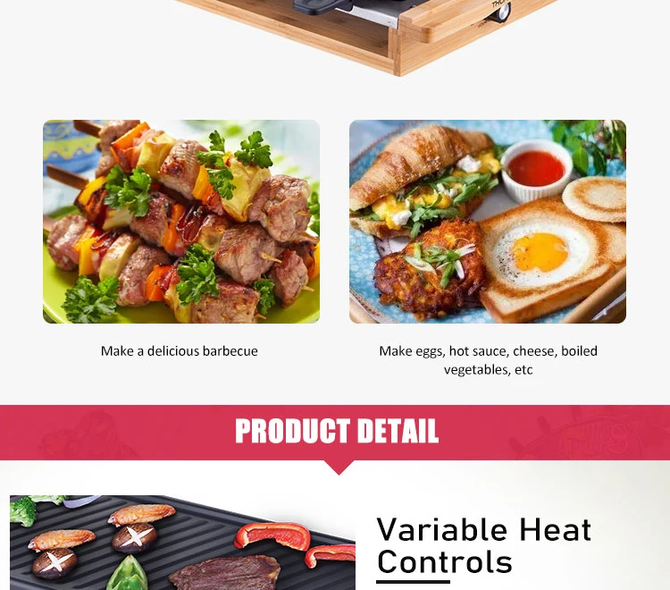 • 【Съемный и washable】рама нашей ракетки и ручки кастрюль изготовлены из высококачественной листовой стали и бамбуковой древесины. Это имеет преимущество быть чрезвычайно стильным, прочным и износостойким. Кроме того, полный гриль raclette может быть легко очищен благодаря прикрепляемым и съемным тарелкам для гриля. Кастрюли можно мыть в посудомоечной машине без каких-либо проблем.