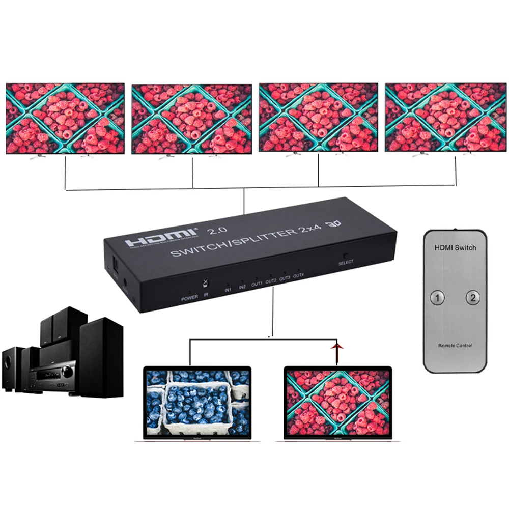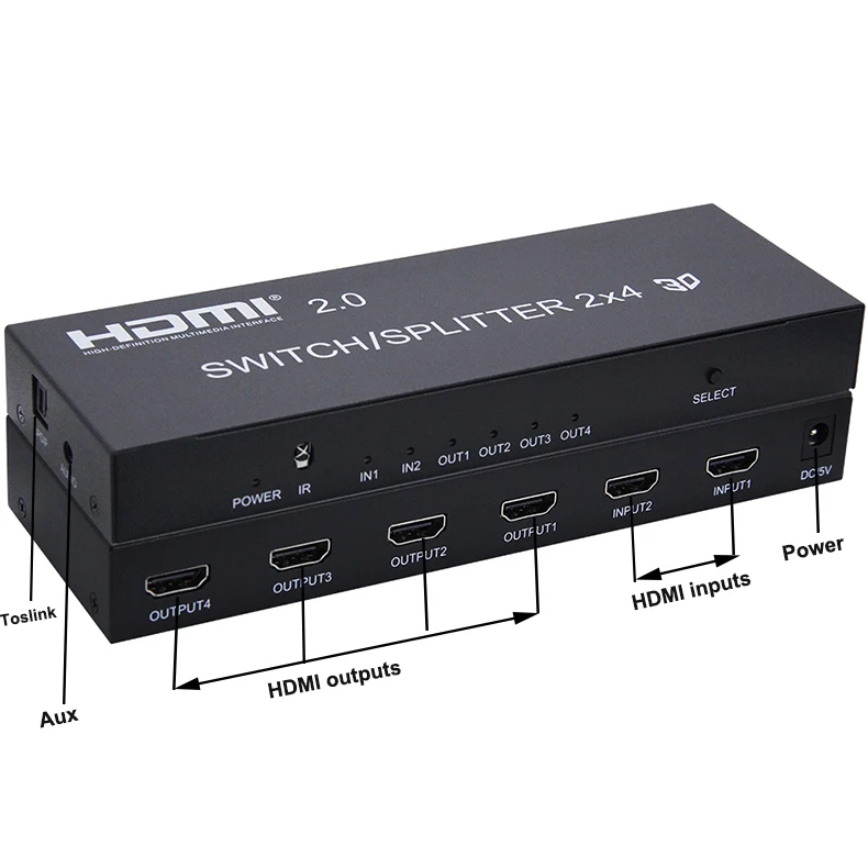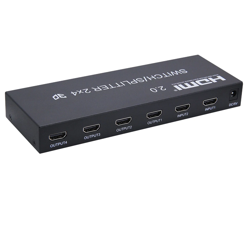 Переключение, разделение и усиление сигнала HDMI с помощью этого переключателя/сплит-устройства. Разделите сигнал HDMI на четыре HDTV или проекторы. Переключение между двумя входными устройствами и одновременная отправка сигнала на дисплеи fours. Не требуется Настройка или специальная конфигурация, просто подключите устройство ввода (ы) и выходное устройство (ы), а затем путайте его. Когда кабель HDMI подключается к выходу HDMI, 2x4 переключатель/сплиттер может усилить HDMI singal. Устройство поддерживает разрешение до 3840X2160 @ 60 Гц, 12 бит на канал глубины цвета, И аудио сигналы высокой четкости. Поддержка 3,5 мм Aux аудиовыхода и SPDIF аудиовыхода.
