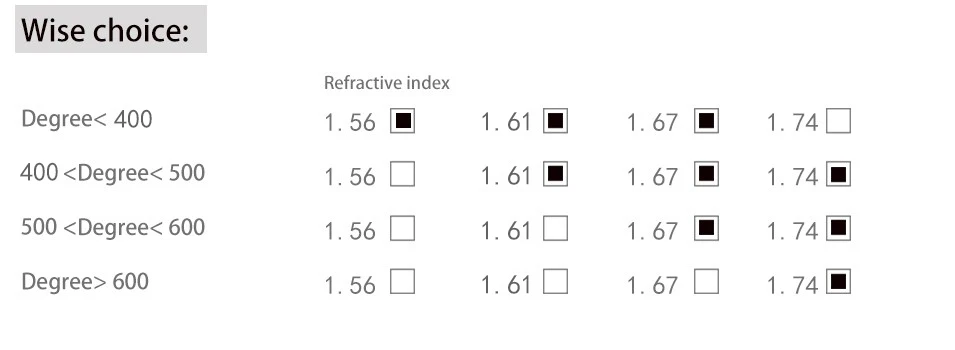 1,56 асферические линзы Рекомендуемая мощность: Близорукость ------ SPH: -0,50 ~-4,00; CYL: -0,50 ~-2,00 Дальнозоркость-SPH:+ 0,50 ~ + 4,00; CYL:+ 0,50 ~ + 2,00 CYL:+ 2,00 ~ + 4,00 или CYL:-2,00 ~-4,00 (добавить $5) 1,61 асферические линзы Рекомендуемая мощность: Близорукость ------ SPH: -0,50 ~-6,00; CYL: -0,50 ~-2,00 Дальнозоркость-SPH:+ 4,00 ~ + 6,00; CYL:+ 0,50 ~ + 2,00 CYL:+ 2,00 ~ + 4,00 или CYL:-2,00 ~-4,00 (добавить $5) 1,67 асферические линзы Рекомендуемая мощность: Близорукость ------ SPH: -3,00 ~-8,00; CYL: -0,50 ~-2,00 Дальнозоркость --- SPH:+ 4,00 ~ + 8,00; CYL:+ 0,50 ~ + 2,00 CYL:+ 2,00 ~ + 4,00 или CYL:-2,00 ~-4,00 (добавить $5) Https:/item/4000794775777.html