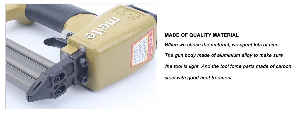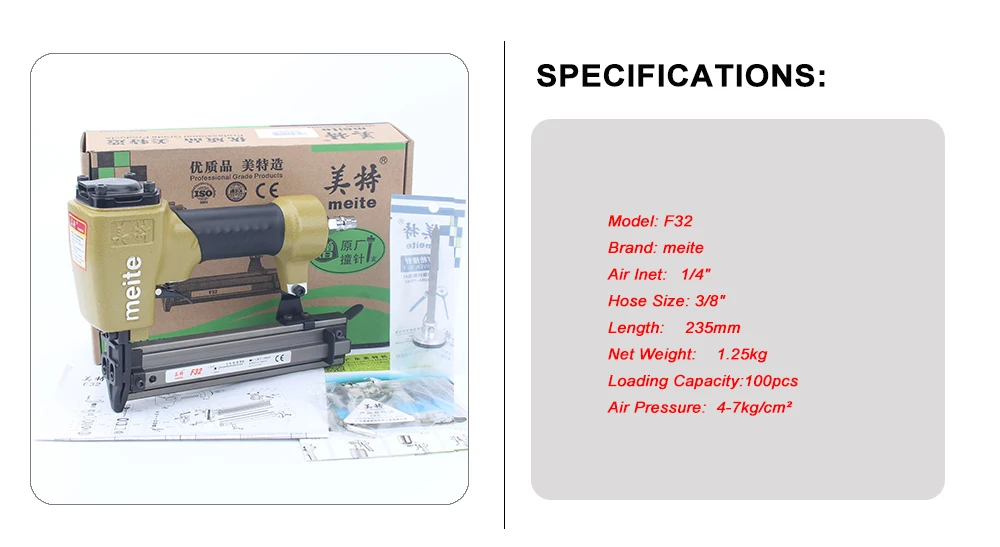 Бренд: meite Модель: F32 Размеры: 60*175*235 мм Емкость: 100 шт./катушка Давление воздуха: 4-7 кг/см2 Монтажная трубка: 6 мм Длина ногтя: 10-32 мм Диаметр гвоздя: 1,26 мм * 1,05 мм Чистая Вес: 1,25 кг