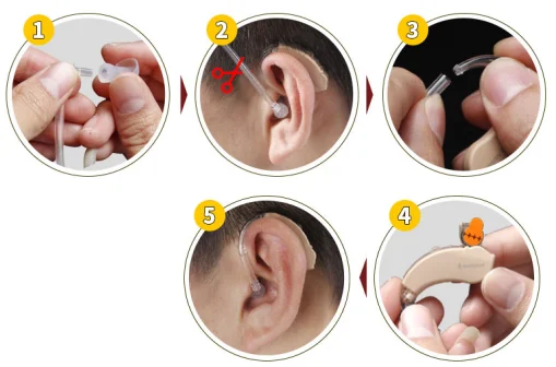 S1: выберите подходящие купола; S2: Подтвердите подходящую длину трубки, если это необходимо, пожалуйста, отрежьте ненужную длину; S3: подключение к крюку слухового аппарата; S4: установите аккумулятор A13 для BTE-P, аккумулятор A675 для BTE-H; S5: Носите его на ухе;