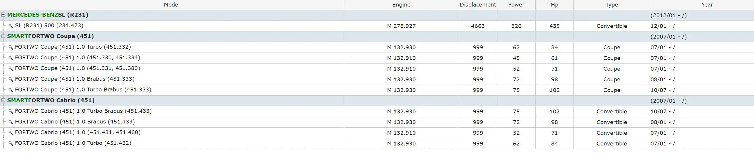 MERCEDES-BENZSL (R231) (2012/01 - /) SL (R231) 500 (231,473) M 278,927 4663 320 435 Кабриолет 12/01 - / SMARTFORTWO Coupe (451) (2007/01 - /) FORTWO Coupe (451) 1,0 Turbo (451,332) M 132,930 999 62 84 Coupe 07/01 - / FORTWO Coupe (451) 1,0 (451,330, 451,334) M 132,910 999 45 61 купе 07/01 - / FORTWO Coupe (451) 1,0 (451,331, 451,380) M 132,910 999 52 71 купе 07/01 - / FORTWO Coupe (451) 1,0 Brabus (451,333) M 132,930 999 72 98 купе 08/01 - / FORTWO Coupe (451) 1,0 Turbo Brabus (451,333) M 132,930 999 75 102 Coupe 10/07 - / SMARTFORTWO Cabrio (451) (2007/01 - /) FORTWO Cabrio (451) 1,0 Turbo Brabus (451,433) M 132,930 999 75 102 Кабриолет 10/07 - / FORTWO Cabrio (451) 1,0 Brabus (451,433) M 132,930 999 72 98 Кабриолет 08/01 - / FORTWO Cabrio (451) 1,0 (451,431, 451,480) M 132,910 999 52 71 Кабриолет 07/01 - / FORTWO Cabrio (451) 1,0 Turbo (451,432) M 132,930 999 62 84 Кабриолет 07/01 - /