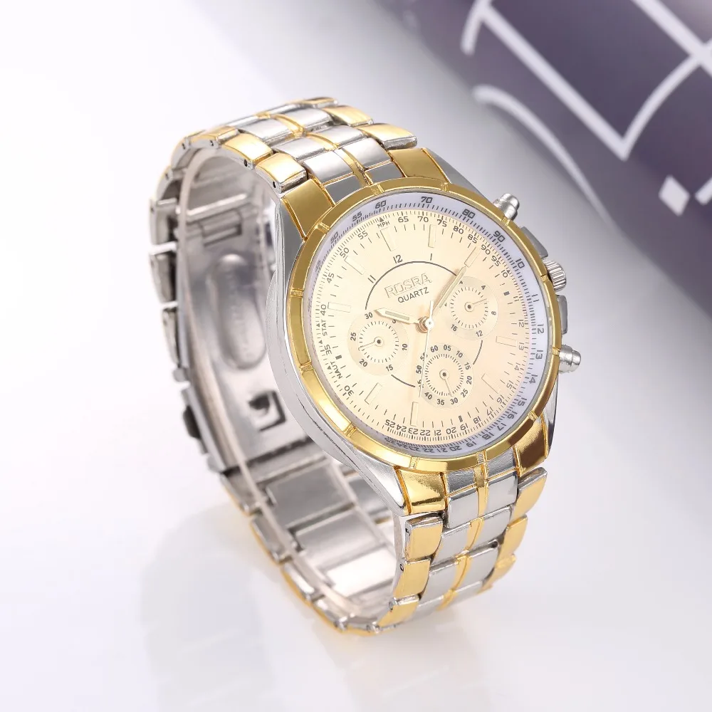 Бренд: ROSRA Часы категории: для мужчин Стиль часов: модный роскошный бизнес Циферблат Форма циферблата: Круглый Тип механизма: кварцевый Тип дисплея: указатель Цвет циферблата: золотой, черный Группа Материал ремешка: нержавеющая сталь Тип застежки: складная застежка с безопасной Размеры и вес Группа длина: 21 см Диаметр циферблата: 4 см Толщина циферблата: 0,9 см Ширина ремешка: 2 см Вес часов: 60 г Посылка 1X часы Водонепроницаемый Описание продукта: (Водонепроницаемый), можно брызгать только немного воды, нельзя мыть или купаться, плавать, нырять